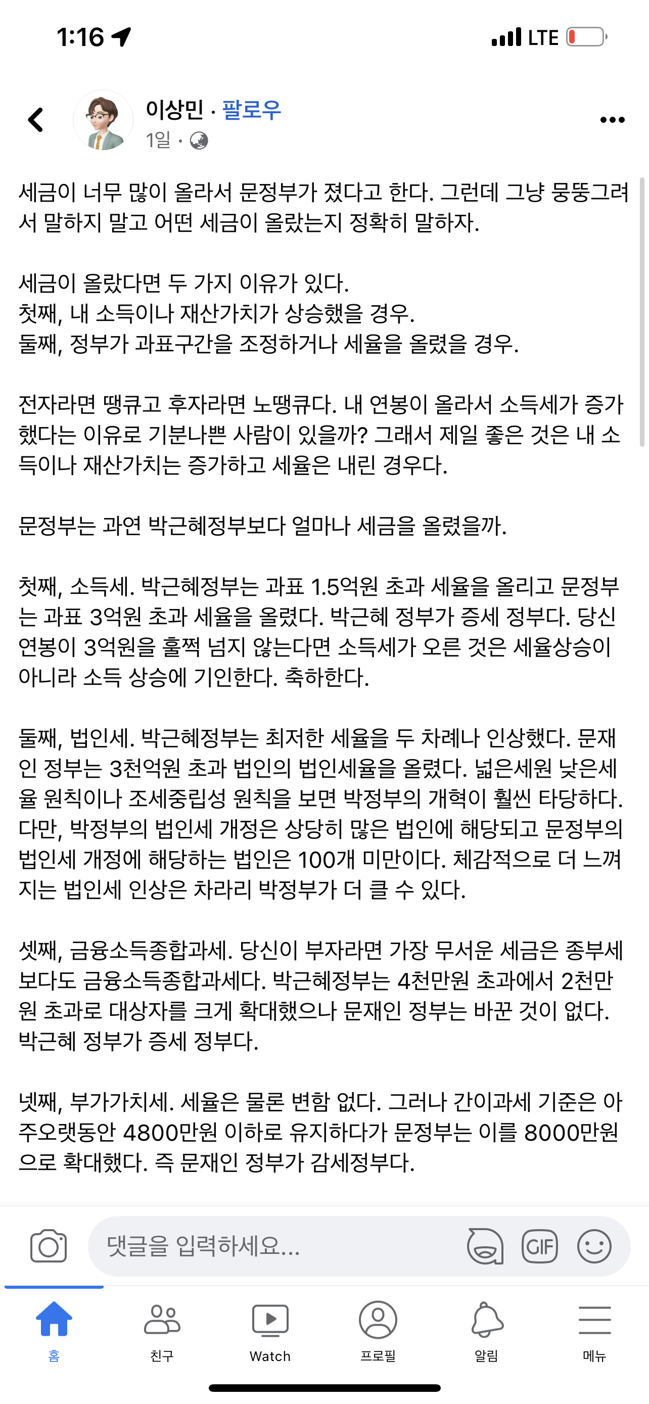 P.S: 박근혜정부 때 소득세 과표 1.5억원 인상, 금융소득종합과세 강화, 최저한세율인상 등을 강력히 주장한 것은 당시 야당인 민주당의 노력이기는 하다. 민주당이 주장하고 박정부가 수용했던 결과....민주당은 야당은 정말 잘한다.