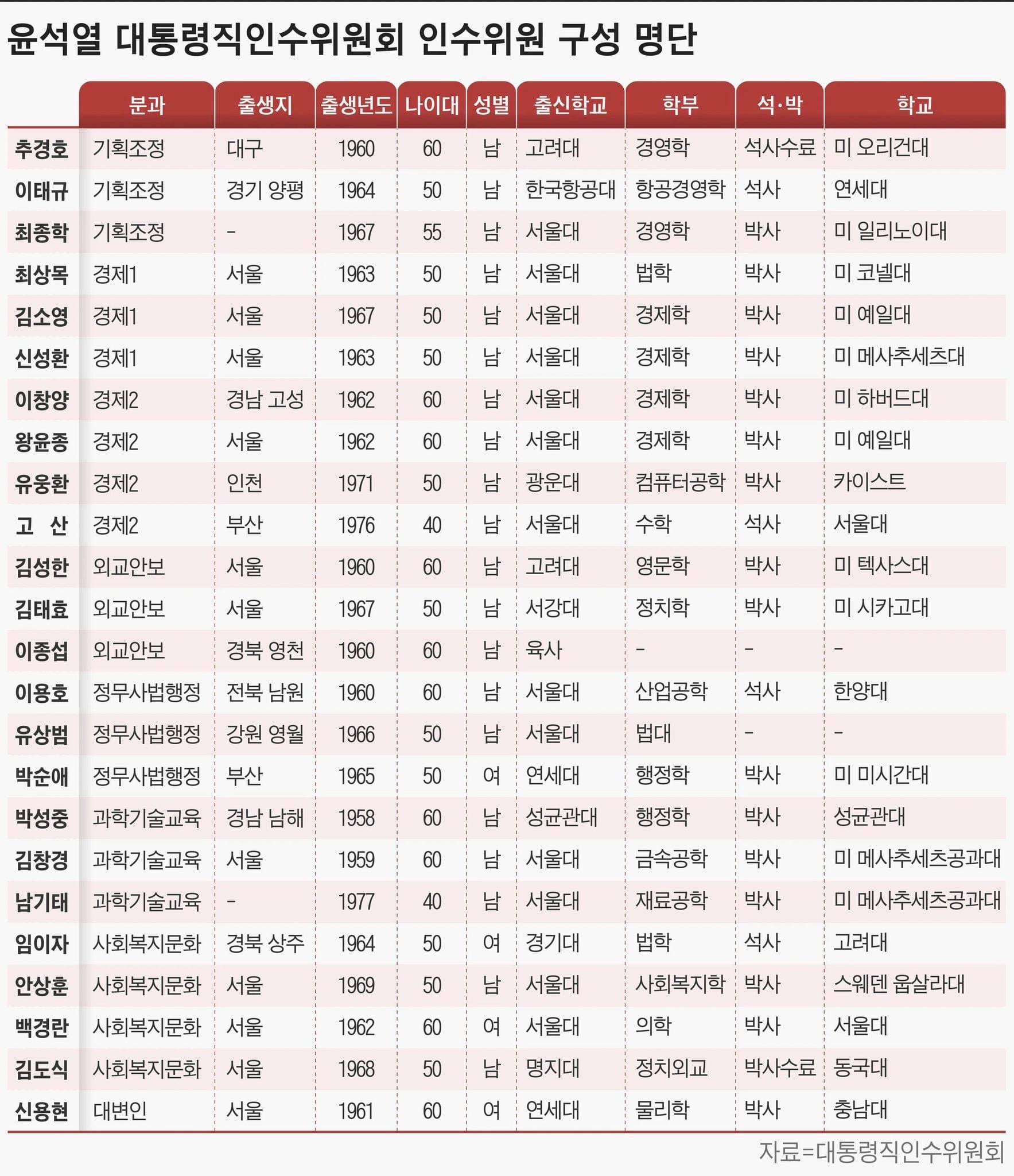 尹 인수위 키워드는 ‘서울대·5060·아이비리그’…“2030 청년 위원 0명”