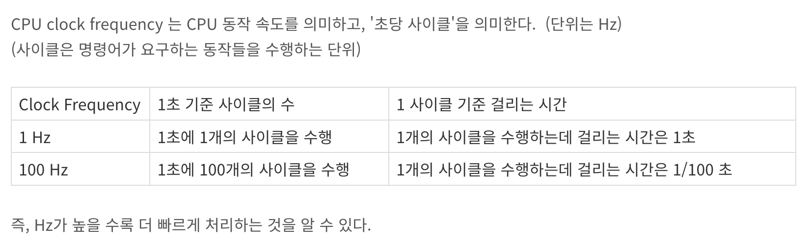 CPU clock frequency 는 CPU 동작 속도를 의미하고, '초당 사이클'을 의미한다. (단위는 Hz) (사이클은 명령어가 요구하는 동작들을 수행하는 단위) Clock Frequency 1초 기준 사이클의 수 1 사이클 기준 걸리