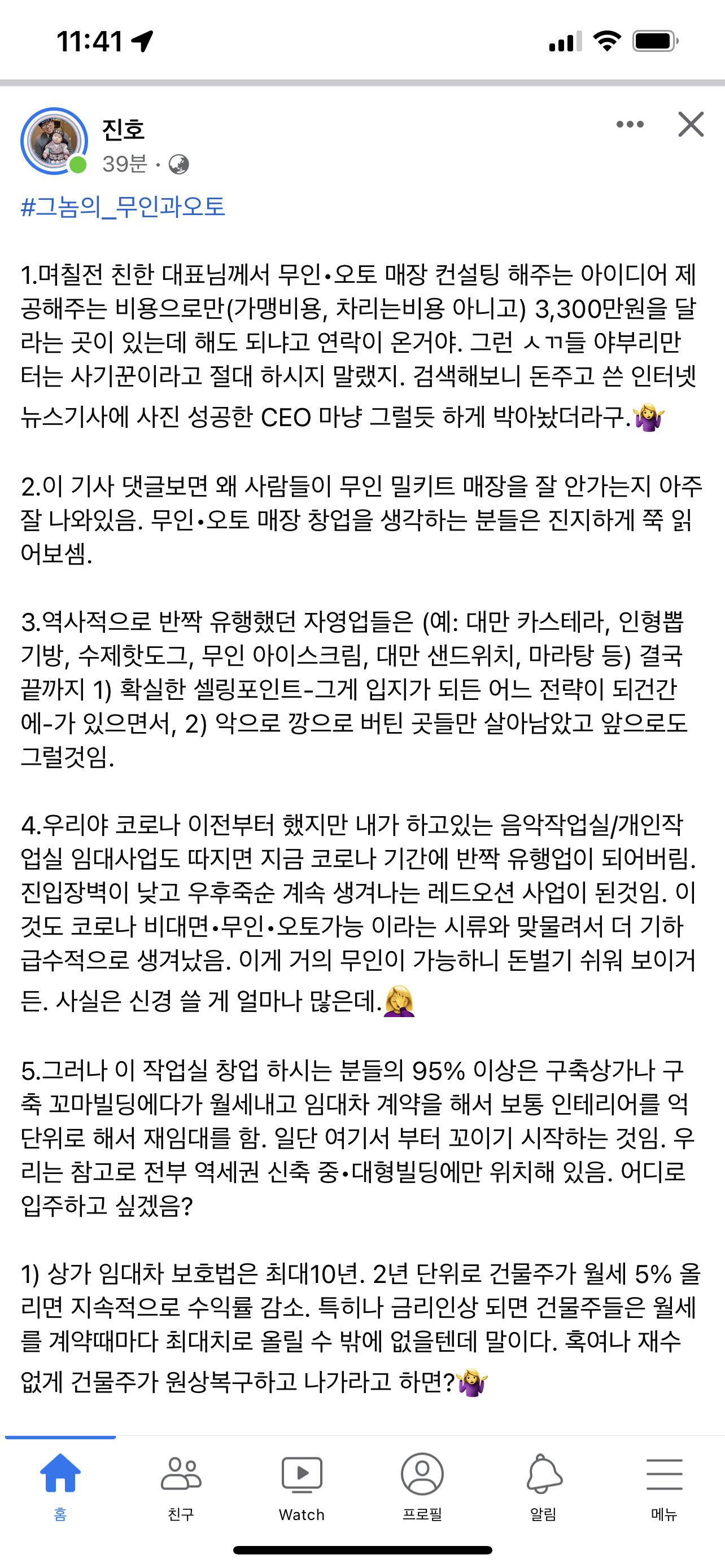 1.며칠전 친한 대표님께서 무인•오토 매장 컨설팅 해주는 아이디어 제공해주는 비용으로만(가맹비용, 차리는비용 아니고) 3,300만원을 달라는 곳이 있는데 해도 되냐고 연락이 온거야. 그런 ㅅㄲ들 야부리만 터는 사기꾼이라고 절대 하시지 말랬지. 검색해보니 돈주고 쓴 인터넷 뉴스기사에 사진 성공한 CEO 마냥 그럴듯 하게 박아놨더라구.🤷♀️