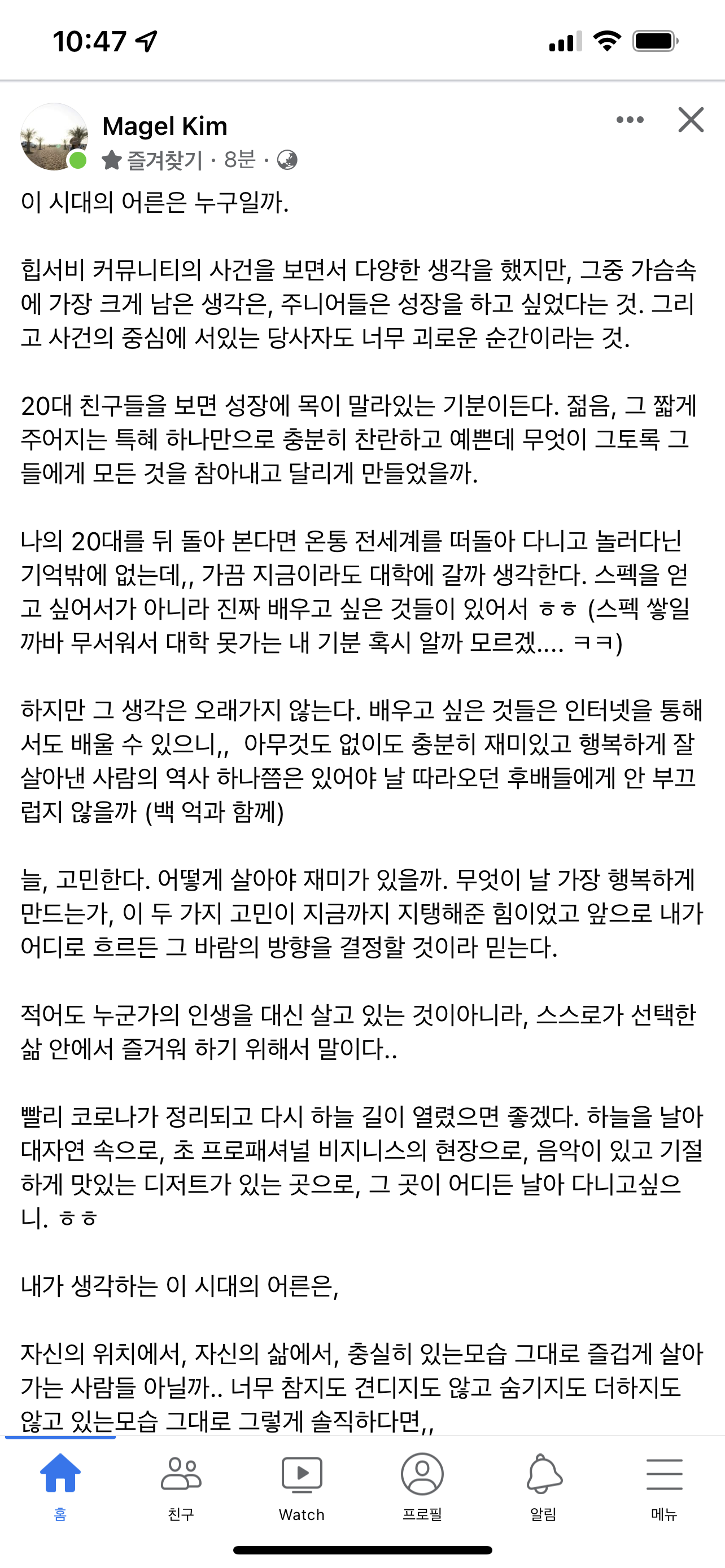 힙서비 커뮤니티의 사건을 보면서 다양한 생각을 했지만, 그중 가슴속에 가장 크게 남은 생각은, 주니어들은 성장을 하고 싶었다는 것. 그리고 사건의 중심에 서있는 당사자도 너무 괴로운 순간이라는 것.