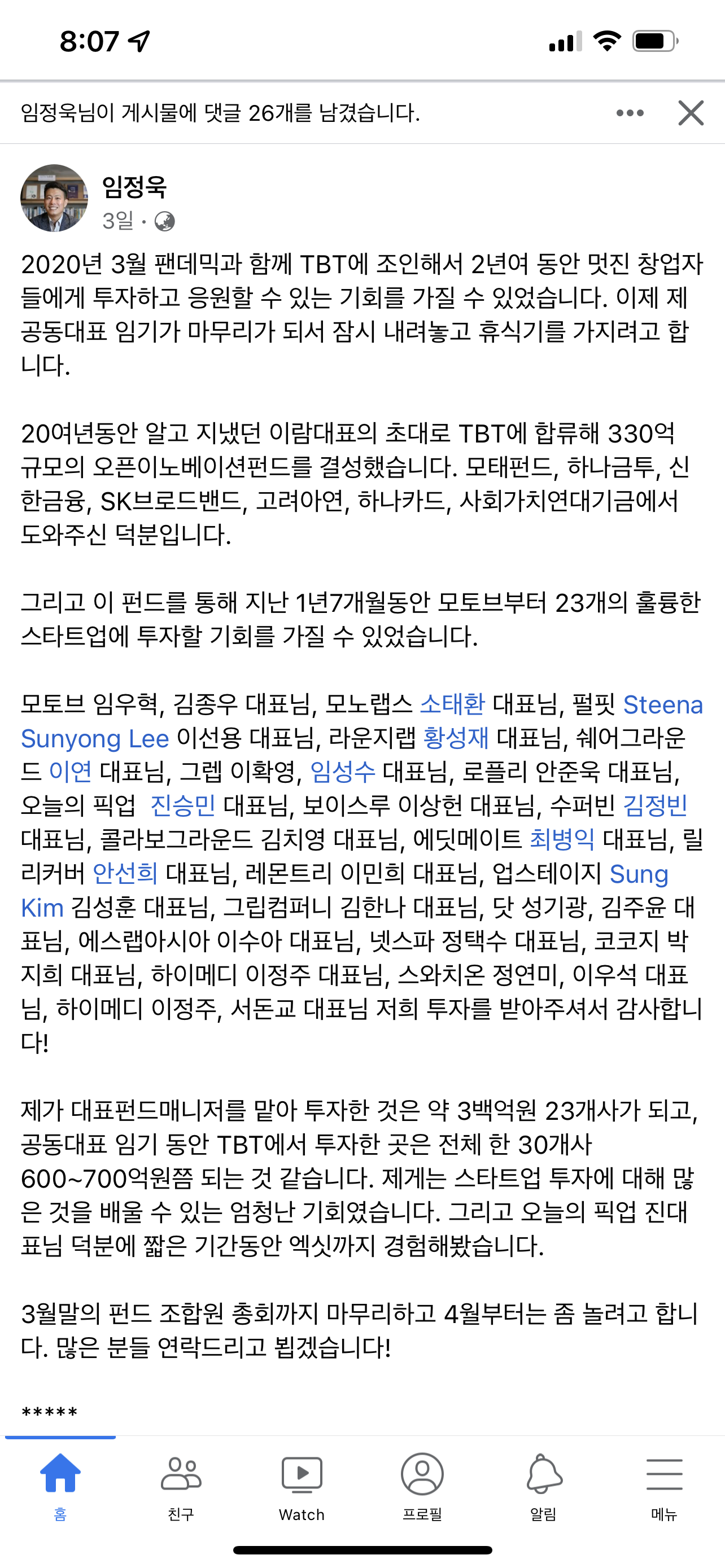 20여년동안 알고 지냈던 이람대표의 초대로 TBT에 합류해 330억 규모의 오픈이노베이션펀드를 결성했습니다. 모태펀드, 하나금투, 신한금융, SK브로드밴드, 고려아연, 하나카드, 사회가치연대기금에서 도와주신 덕분입니다.