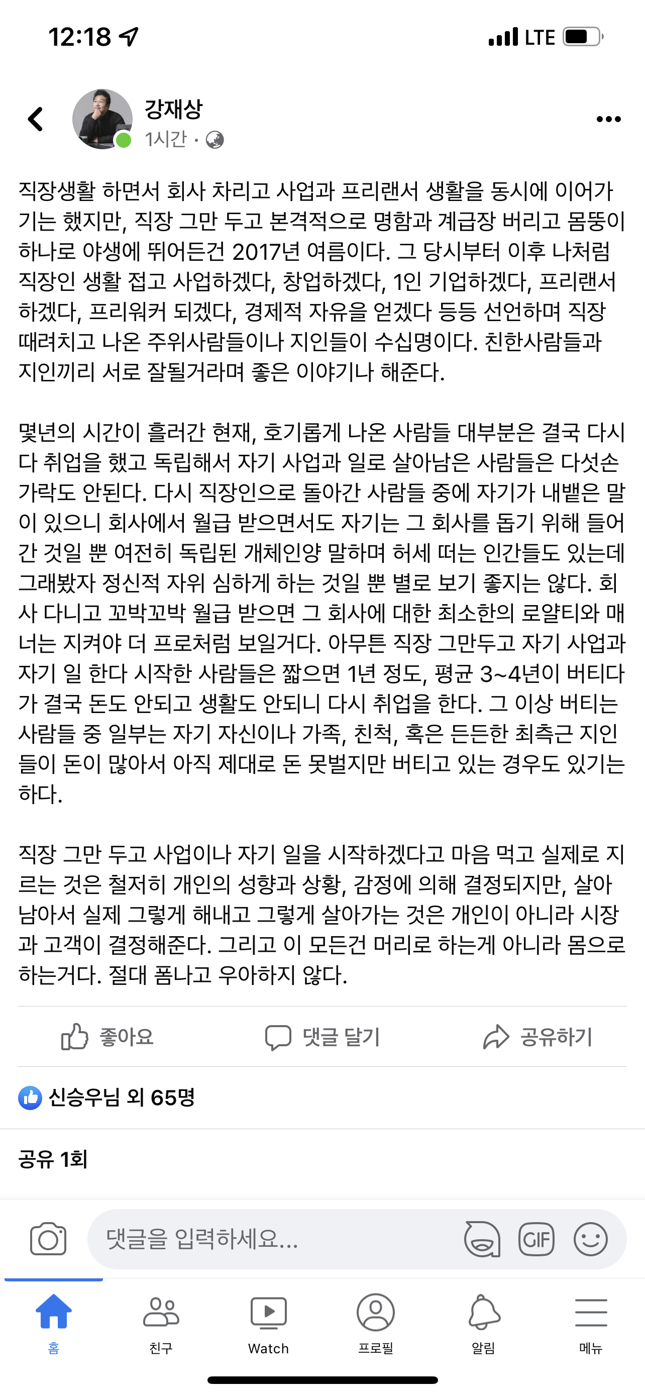 직장생활 하면서 회사 차리고 사업과 프리랜서 생활을 동시에 이어가기는 했지만, 직장 그만 두고 본격적으로 명함과 계급장 버리고 몸뚱이 하나로 야생에 뛰어든건 2017년 여름이다. 그 당시부터 이후 나처럼 직장인 생활 접고 사업하겠다, 창업하겠다, 1인 기업하겠다, 프리랜서하겠다, 프리워커 되겠다, 경제적 자유을 얻겠다 등등 선언하며 직장 때려치고 나온 주위사람들이나 지인들이 수십명이다. 친한사람들과 지인끼리 서로 잘될거라며 좋은 이야기나 해준다.