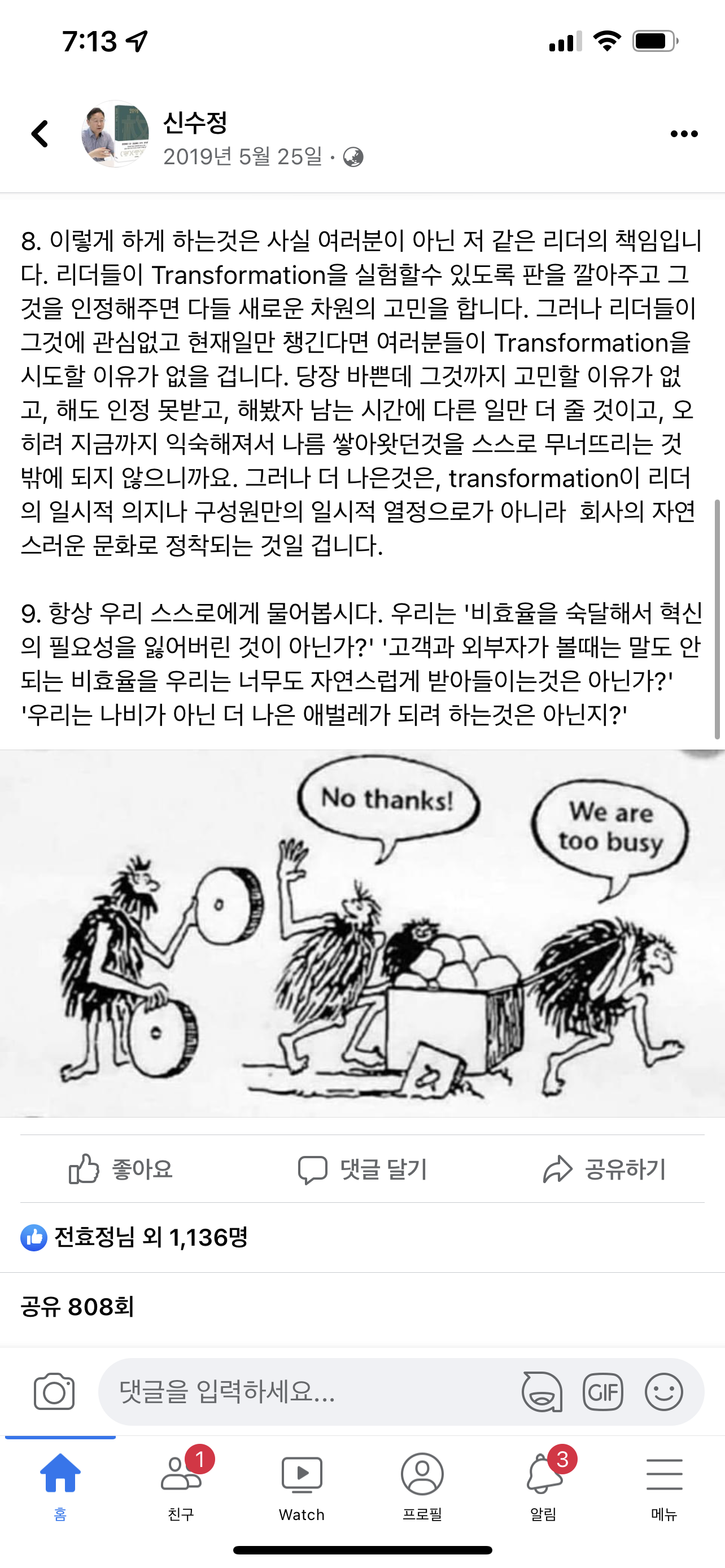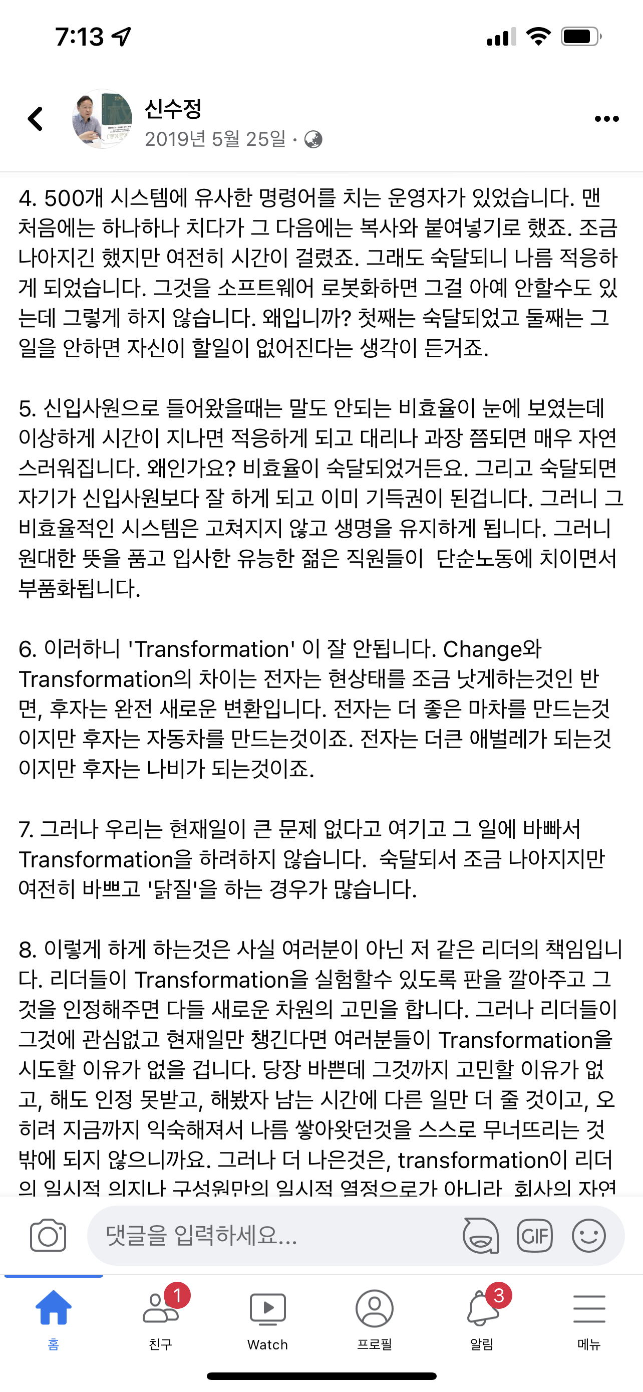7. 그러나 우리는 현재일이 큰 문제 없다고 여기고 그 일에 바빠서 Transformation을 하려하지 않습니다. 숙달되서 조금 나아지지만 여전히 바쁘고 '닭질'을 하는 경우가 많습니다.