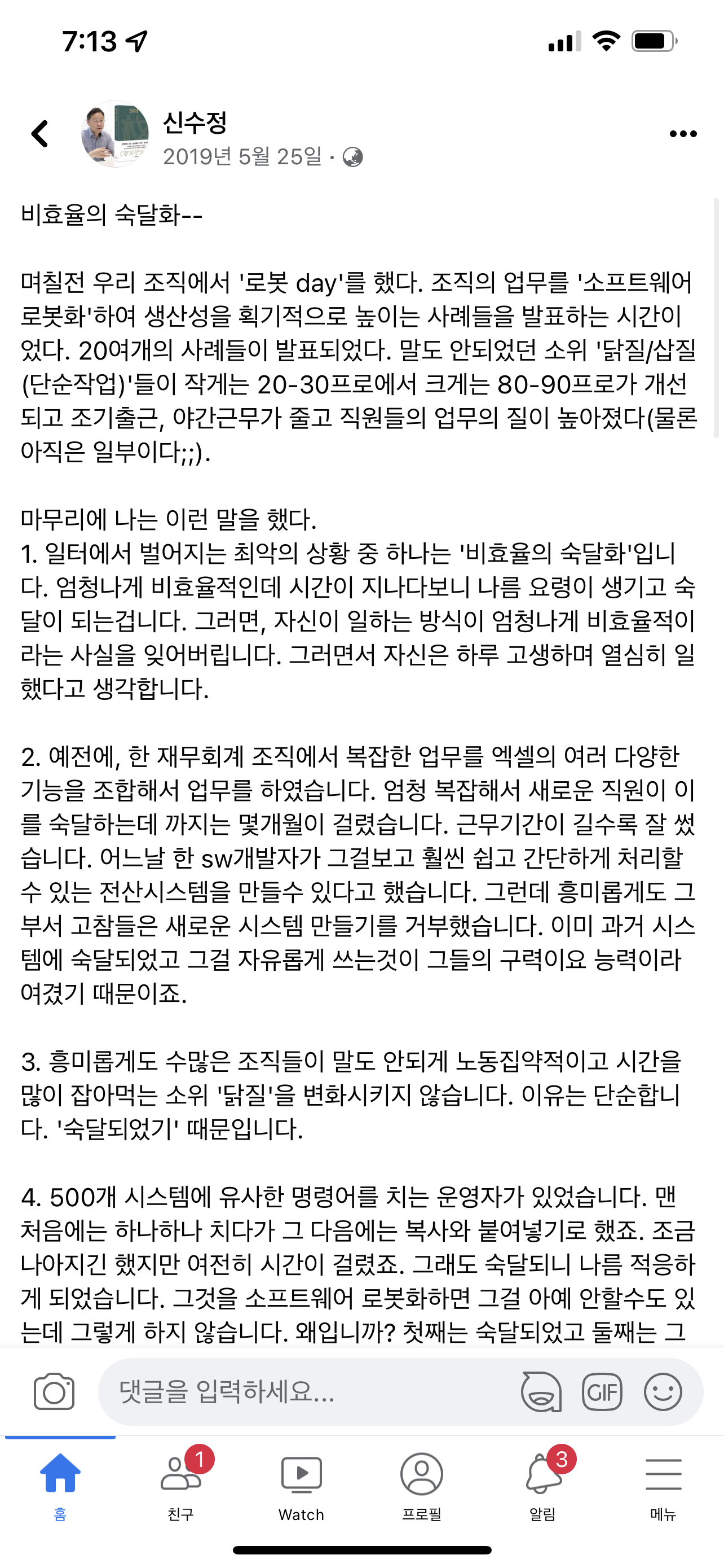 1. 일터에서 벌어지는 최악의 상황 중 하나는 '비효율의 숙달화'입니다. 엄청나게 비효율적인데 시간이 지나다보니 나름 요령이 생기고 숙달이 되는겁니다. 그러면, 자신이 일하는 방식이 엄청나게 비효율적이라는 사실을 잊어버립니다. 그러면서 자신은 하루 고생하며 열심히 일했다고 생각합니다.