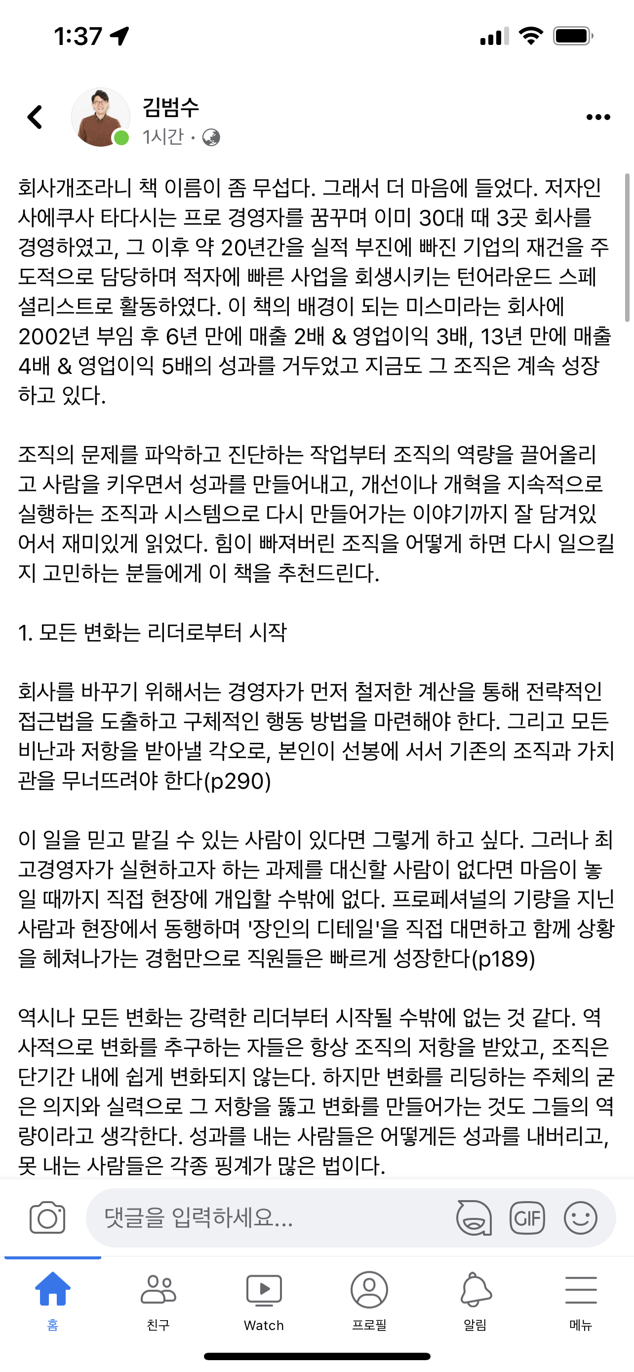 조직의 문제를 파악하고 진단하는 작업부터 조직의 역량을 끌어올리고 사람을 키우면서 성과를 만들어내고, 개선이나 개혁을 지속적으로 실행하는 조직과 시스템으로 다시 만들어가는 이야기까지 잘 담겨있어서 재미있게 읽었다. 힘이 빠져버린 조직을 어떻게 하면 다시 일으킬지 고민하는 분들에게 이 책을 추천드린다.