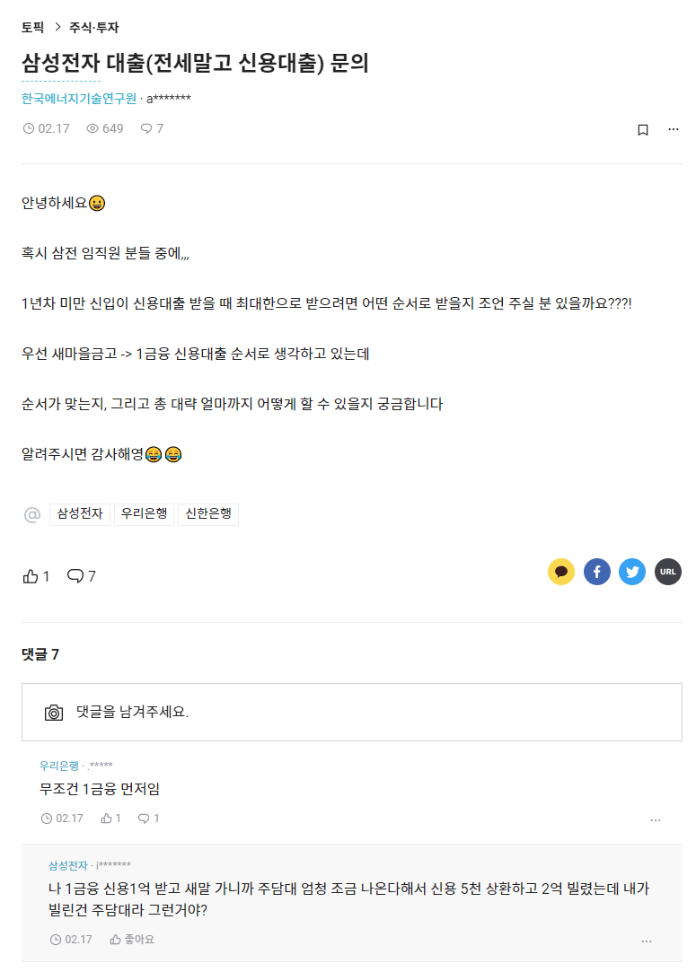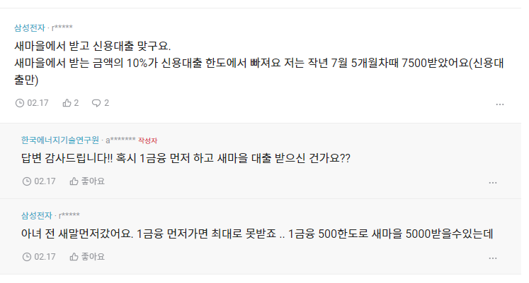 안녕하세요😀혹시 삼전 임직원 분들 중에,,,1년차 미만 신입이 신용대출 받을 때 최대한으로 받으려면 어떤 순서로 받을지 조언 주실 분 있을까요???!우선 새마을금고 -> 1금융 신용대출 순서로