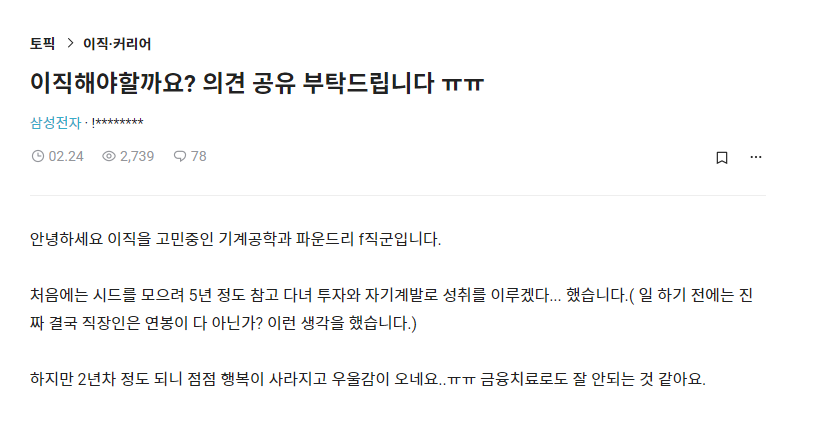 안녕하세요 이직을 고민중인 기계공학과 파운드리 f직군입니다.처음에는 시드를 모으려 5년 정도 참고 다녀 투자와 자기계발로 성취를 이루겠다... 했습니다.( 일 하기 전에는 진짜 결국 직장인