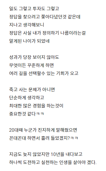 20대로 돌아가면 하고 싶은일 있어??10년전 허허벌판이였던곳에 도시가 생기는걸 보니어른들이 말한 10년이면 강산이 변한다는 말이 무엇인지 체감하고 이해할수 있더라고서른 중반 넘어서 돌아