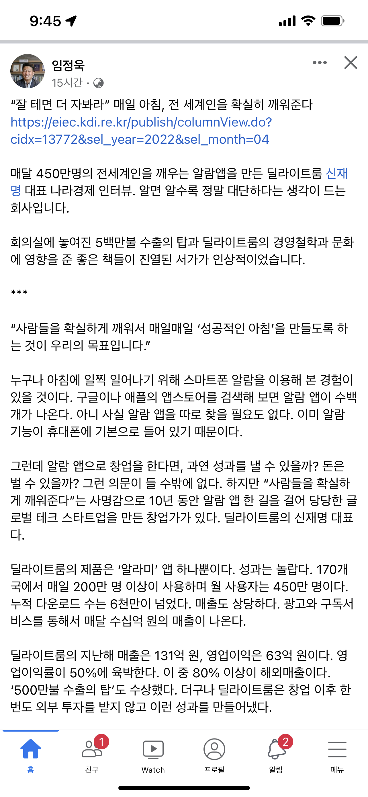 큰 성공에도 교만하지 않고 직원들을 위해 행복한 기업을 만들겠다는 신 대표의 비전, 그리고 다른 영역으로 한눈팔지 않고 알람 앱 하나에만 몰두해 온 집중력과 열정이 놀랍기만 하다. 젊은이들에게 성장의 기회를 제공하는 이런 보석 같은 스타트업이 더 많이 쏟아져 나오기를 기대한다. 탄탄하게 기본을 쌓은 딜라이트룸이 이제 도약을 시작해 10년 뒤에는 웰니스 유니콘 기업으로 성장할 것을 믿어 의심치 않는다.