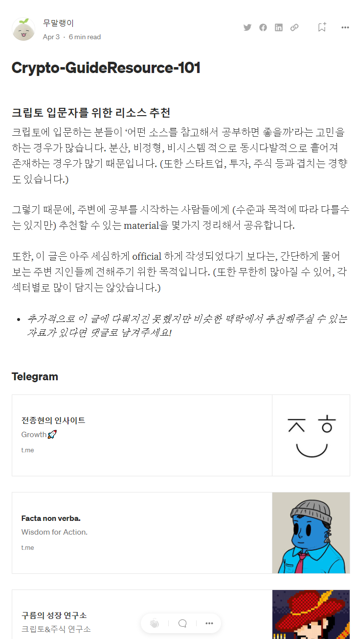 크립토에 입문하는 분들이 ‘어떤 소스를 참고해서 공부하면 좋을까’라는 고민을 하는 경우가 많습니다. 분산, 비정형, 비시스템 적으로 동시다발적으로 흩어져 존재하는 경우가 많기 때문입