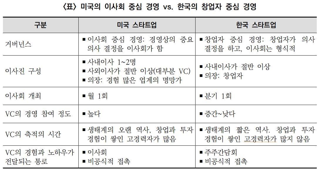 2. 한국과 미국의 스타트업 생태계는 여러 면에서 다르고 각 차이들은 서로 연결되어 있기도 한데, 그 중 아마 가장 중요한 차이는 스타트업의 거버넌스 구조 및 이와 연결된 벤처캐피탈(VC)의 역할일 것이다. 미국은 이사회에서 모든 경영상의 주요 결정을 하는 이사회 중심 거버넌스인 반면, 한국은 창업자가 주요 의사 결정을 하고 이사회는 형식적으로 운영되는 창업자 중심 거버넌스라는 점에서 차이를 보인다.