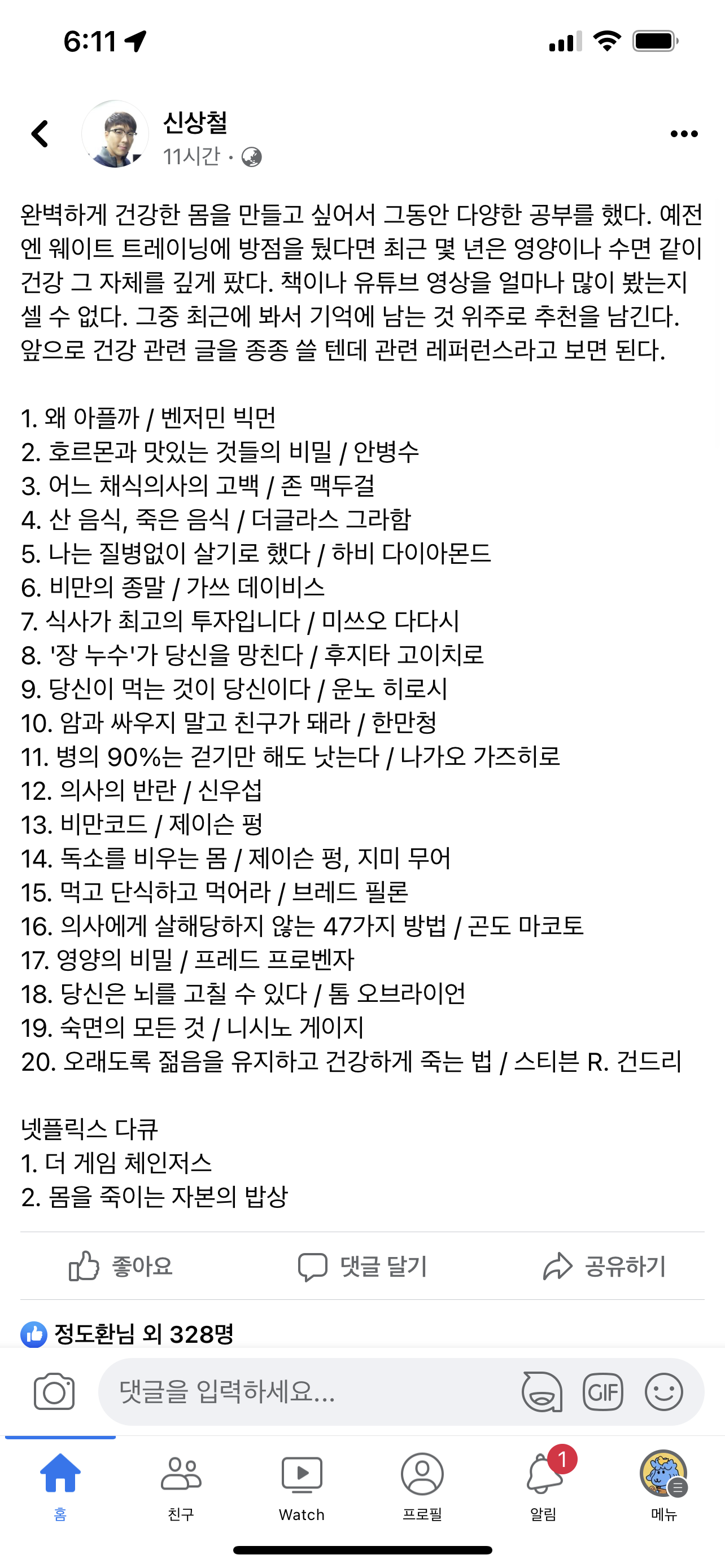 완벽하게 건강한 몸을 만들고 싶어서 그동안 다양한 공부를 했다. 예전엔 웨이트 트레이닝에 방점을 뒀다면 최근 몇 년은 영양이나 수면 같이 건강 그 자체를 깊게 팠다. 책이나 유튜브 영상을 얼마나 많이 봤는지 셀 수 없다. 그중 최근에 봐서 기억에 남는 것 위주로 추천을 남긴다. 앞으로 건강 관련 글을 종종 쓸 텐데 관련 레퍼런스라고 보면 된다.