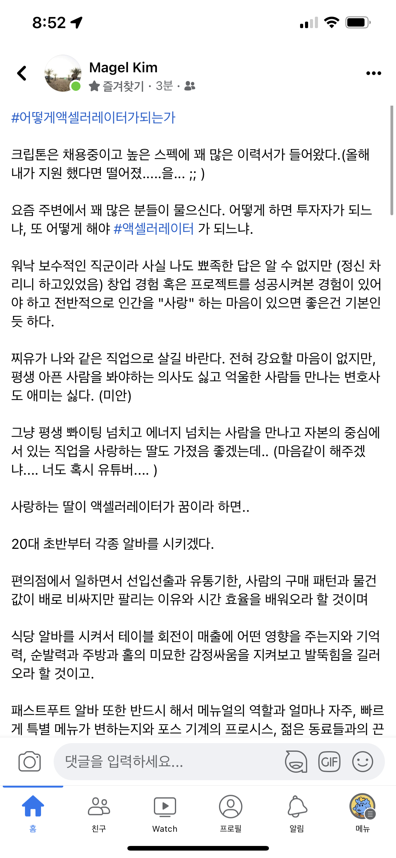 사랑하는 딸이 액셀러레이터가 꿈이라 하면.. 20대 초반부터 각종 알바를 시키겠다.