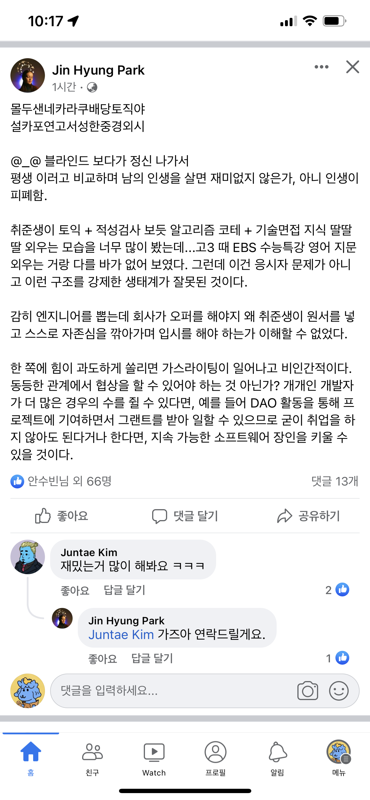 취준생이 토익 + 적성검사 보듯 알고리즘 코테 + 기술면접 지식 딸딸딸 외우는 모습을 너무 많이 봤는데...고3 때 EBS 수능특강 영어 지문 외우는 거랑 다를 바가 없어 보였다. 그런데 이건 응시자 문제가 아니고 이런 구조를 강제한 생태계가 잘못된 것이다.