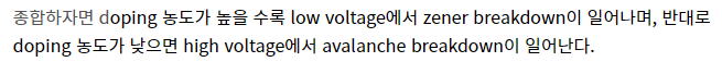 일반적인 pn junction diode에서 reverse bias를 가해줄 경우 전류가 흐르지 않는다. 그런데 특정 reverse bias 조건에서 전류가 흘러버리는 경우가 발생하는데 이를 breakdown이라고 한다. 이러한 breakdown의 종