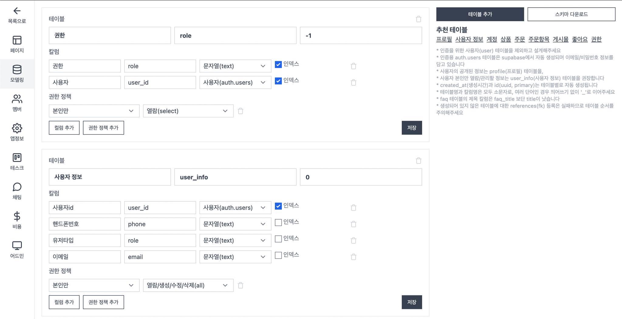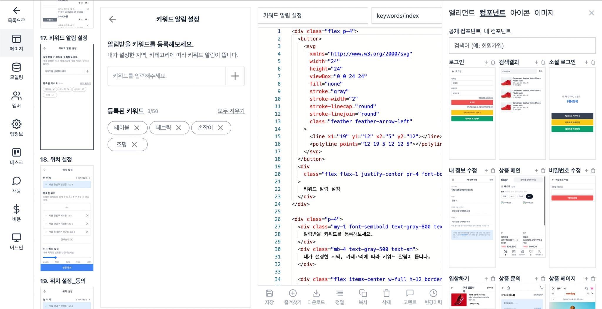 자체적으로 개발하고 있는 빌더를 사용하여 프론트엔드 개발(이미지 참조)과 데이터베이스 모델링에 걸리는 시간을 1/3 정도로 줄이고 있습니다. 아직 외부에 공개하기에는 미흡한 부분이 있지만 내부적으로는 신규 프로젝트에 빌더를 활용하면서 안전하고 빠르게 프론트엔드 개발을 할 수 있고 개발자간 코드와 모델링 관련한 협업을 더 효율적으로 할 수 있습니다. 스벨트로 빌더를 만들고 있기 때문에 필요한 기능을 거의 실시간으로 구축하면서 활용하고 있습니다.