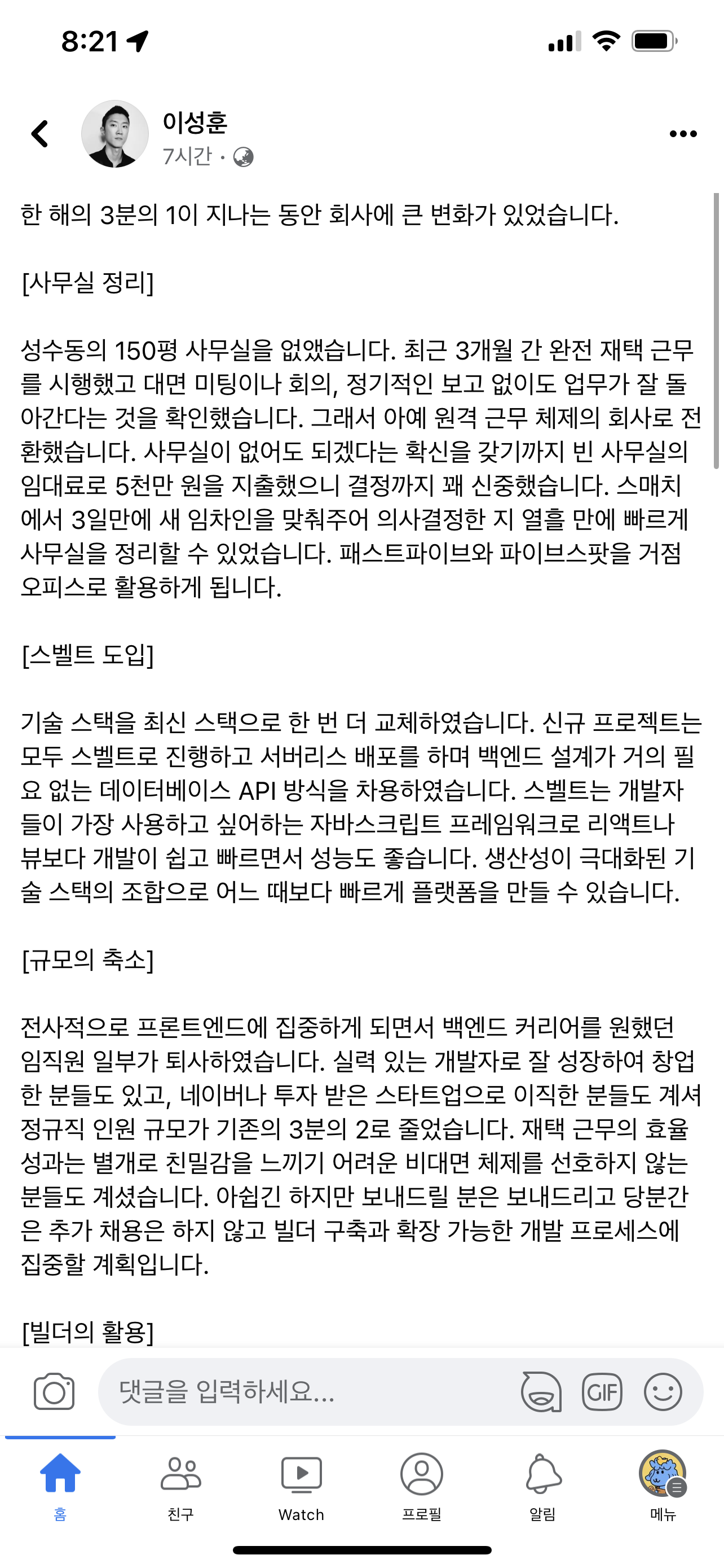 전사적으로 프론트엔드에 집중하게 되면서 백엔드 커리어를 원했던 임직원 일부가 퇴사하였습니다. 실력 있는 개발자로 잘 성장하여 창업한 분들도 있고, 네이버나 투자 받은 스타트업으로 이직한 분들도 계셔 정규직 인원 규모가 기존의 3분의 2로 줄었습니다. 재택 근무의 효율성과는 별개로 친밀감을 느끼기 어려운 비대면 체제를 선호하지 않는 분들도 계셨습니다. 아쉽긴 하지만 보내드릴 분은 보내드리고 당분간은 추가 채용은 하지 않고 빌더 구축과 확장 가능한 개발 프로세스에 집중할 계획입니다.