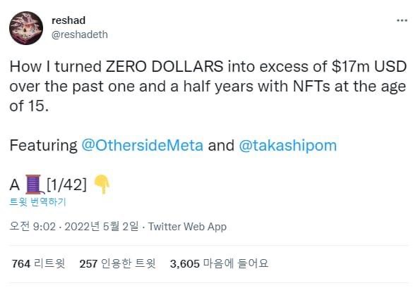 <15살 트위터 잼민이 @reshadeth가 지난 1년 반 동안의 NFT씬 여행을 통해 1700만달러(215억)의 순자산을 갖게 된 이야기>
