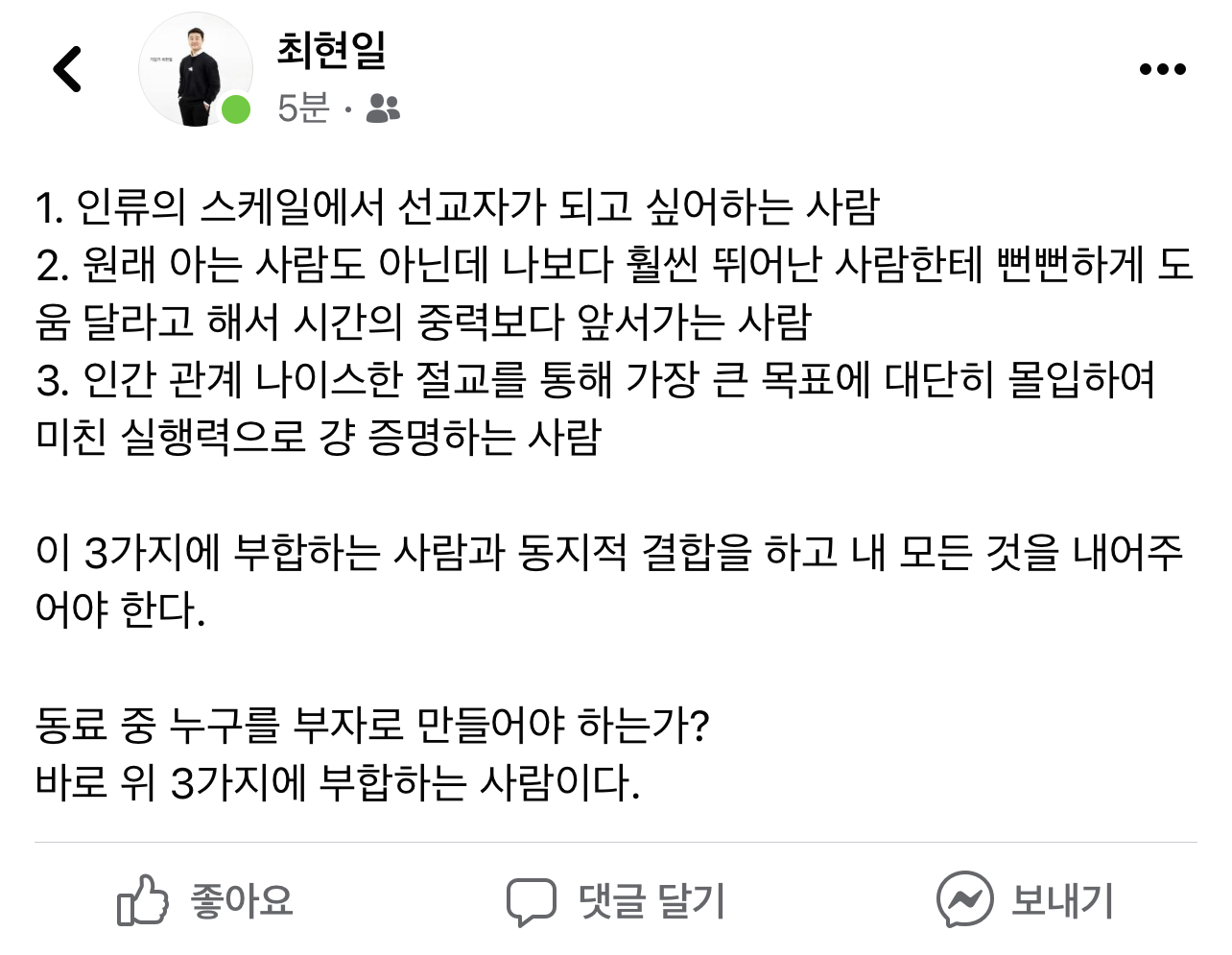 이 3가지에 부합하는 사람과 동지적 결합을 하고 내 모든 것을 내어주어야 한다.