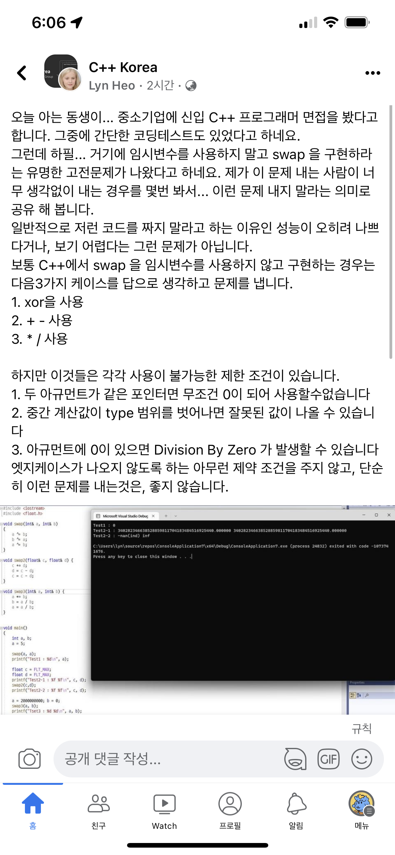 그런데 하필... 거기에 임시변수를 사용하지 말고 swap 을 구현하라는 유명한 고전문제가 나왔다고 하네요. 제가 이 문제 내는 사람이 너무 생각없이 내는 경우를 몇번 봐서... 이런 문제 내지 말라는 의미로 공유 해 봅니다.