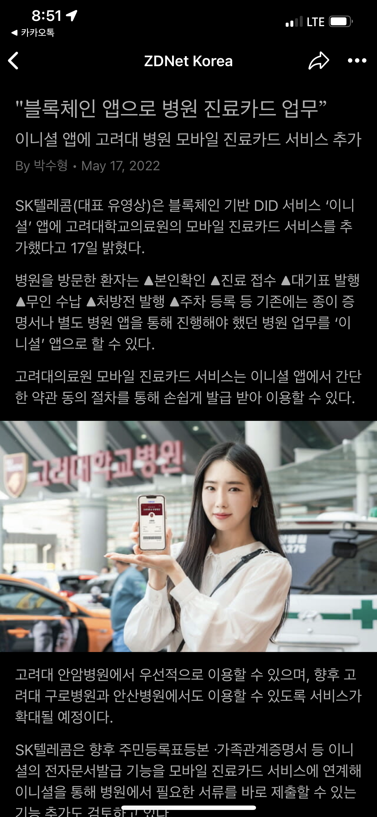 SK텔레콤(대표 유영상)은 블록체인 기반 DID 서비스 ‘이니셜’ 앱에 고려대학교의료원의 모바일 진료카드 서비스를 추가했다고 17일 밝혔다.병원을 방문한 환자는 ▲본인확인 ...