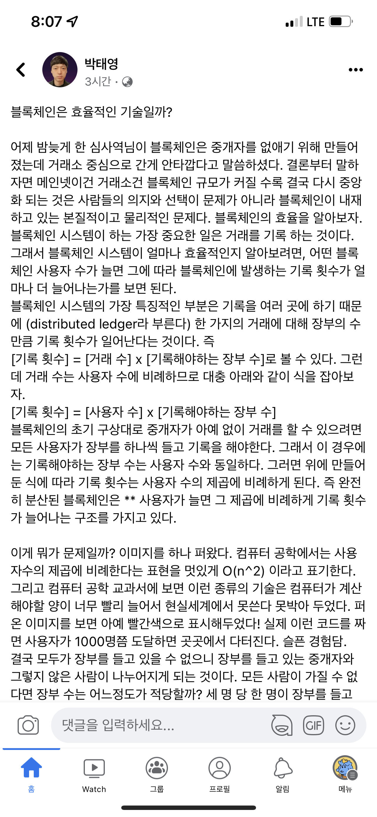 [요약] 별도의 중개자가 없는 블록체인은 O(n^2) 구조로 비용 때문에 현실세계에 구현이 불가능하다. 가장 비효율적이지만 현실 세계에 구현이 가능한 구조는 O(nlogn)인데 이를 따르려면 블록체인의 사용자가 많아질수록 기하급수적으로 중앙화 될 수 밖에 없다. 이는 채굴 비용이나 거래 처리 방식과는 무관하다.