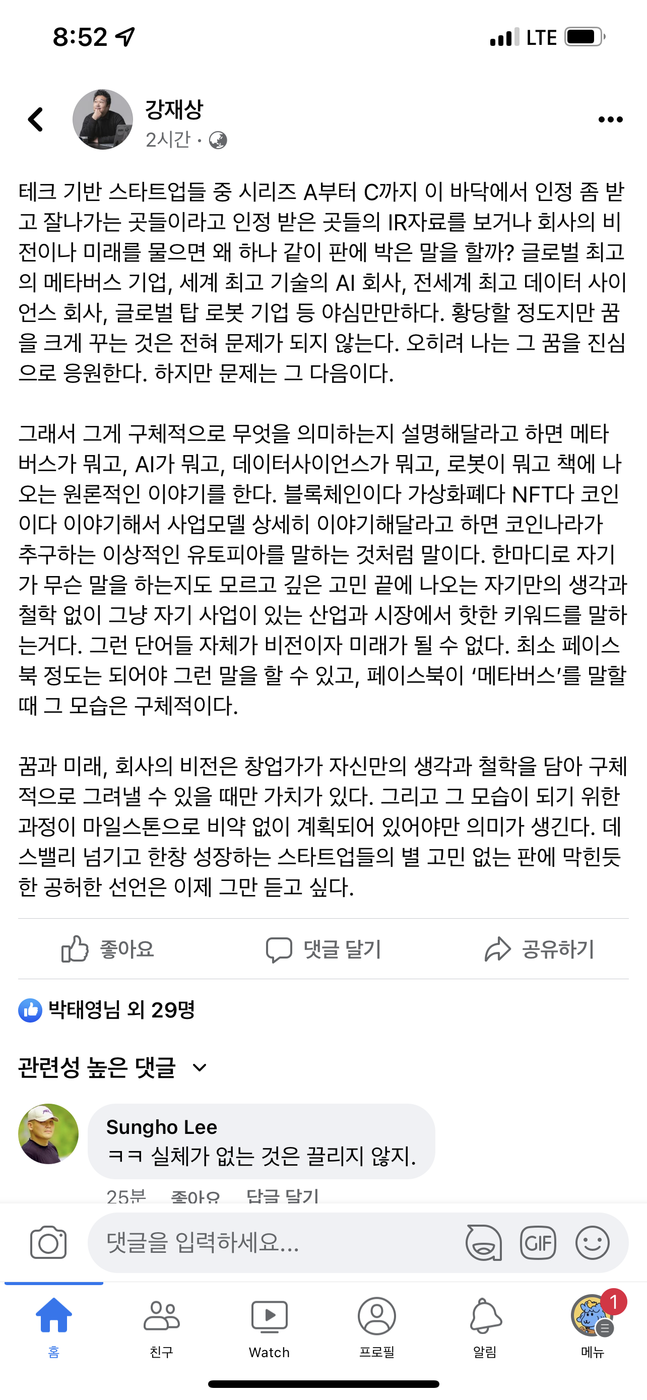 그래서 그게 구체적으로 무엇을 의미하는지 설명해달라고 하면 메타버스가 뭐고, AI가 뭐고, 데이터사이언스가 뭐고, 로봇이 뭐고 책에 나오는 원론적인 이야기를 한다. 블록체인이다 가상화폐다 NFT다 코인이다 이야기해서 사업모델 상세히 이야기해달라고 하면 코인나라가 추구하는 이상적인 유토피아를 말하는 것처럼 말이다. 한마디로 자기가 무슨 말을 하는지도 모르고 깊은 고민 끝에 나오는 자기만의 생각과 철학 없이 그냥 자기 사업이 있는 산업과 시장에서 핫한 키워드를 말하는거다. 그런 단어들 자체가 비전이자 미래가 될 수 없다. 최소 페이스북 정도는 되어야 그런 말을 할 수 있고, 페이스북이 ‘메타버스’를 말할 때 그 모습은 구체적이다.