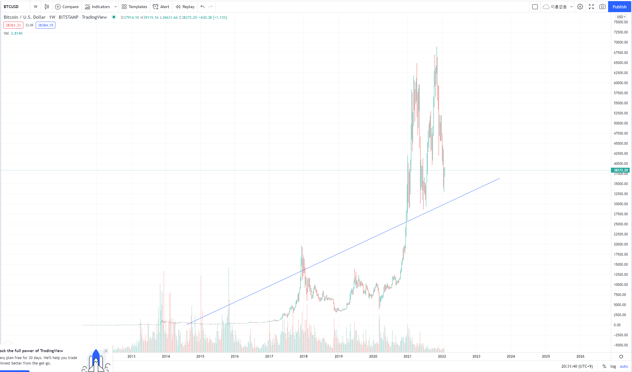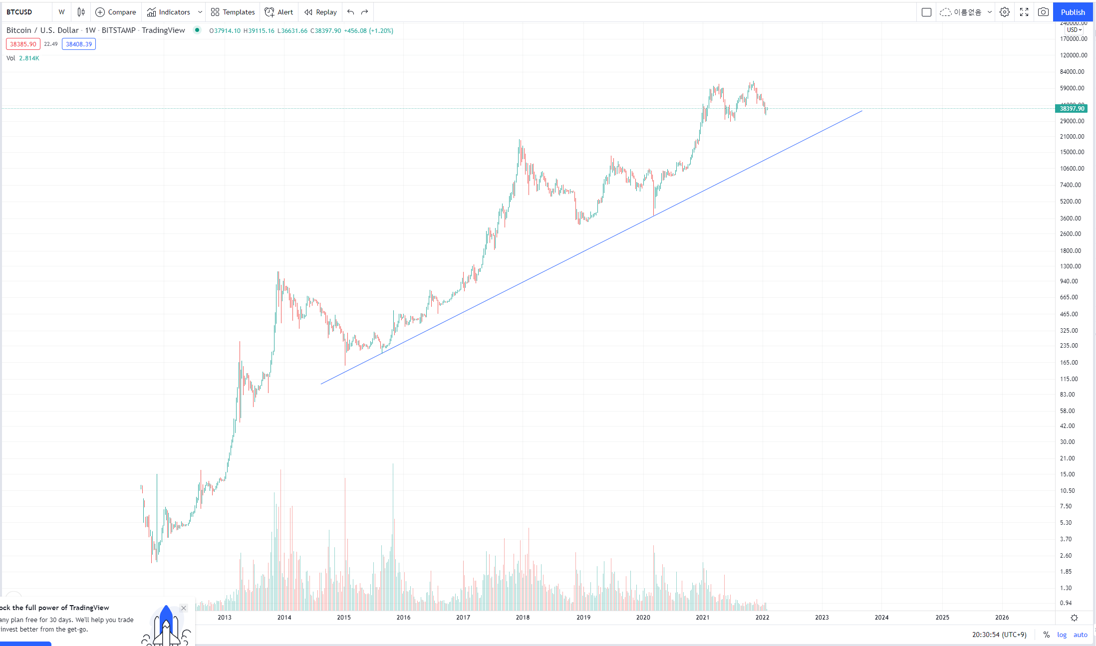 자. 트레이딩뷰에서 어떻게 로그장기추세선을 그을 수 있는지 실전 적용을 하자.