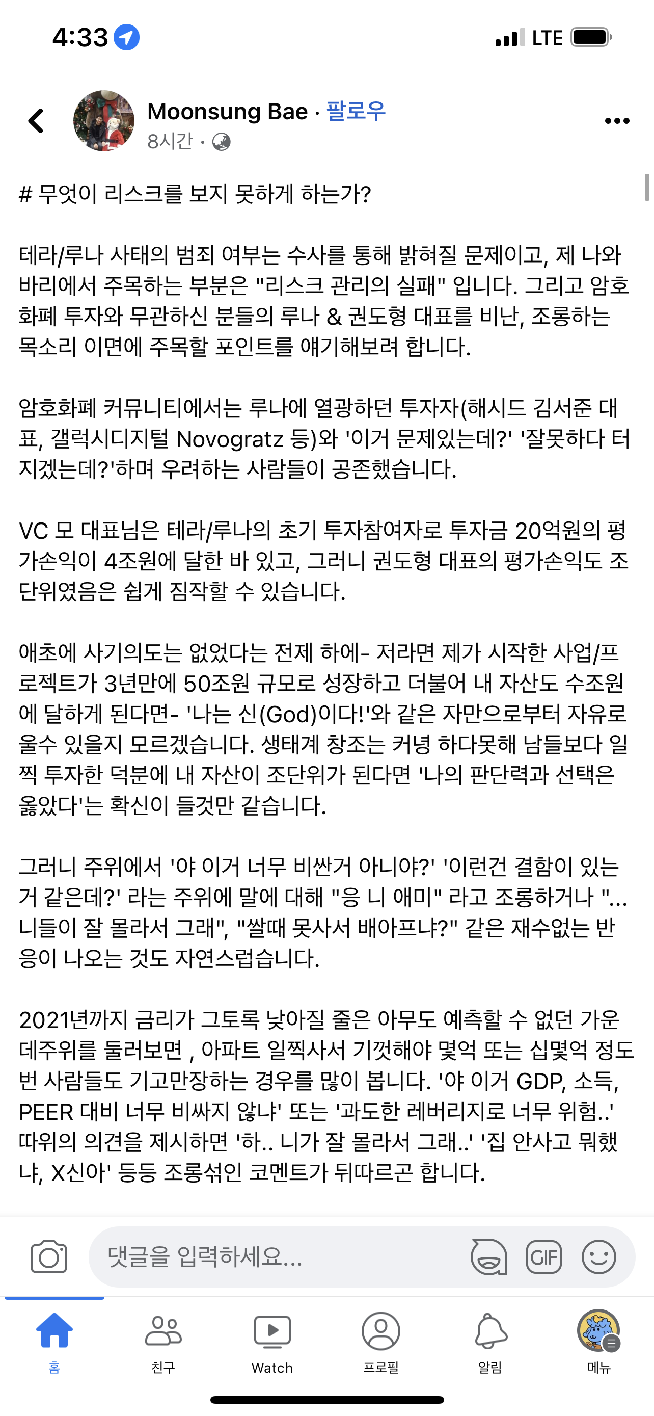 테라/루나 사태의 범죄 여부는 수사를 통해 밝혀질 문제이고, 제 나와바리에서 주목하는 부분은 "리스크 관리의 실패" 입니다. 그리고 암호화폐 투자와 무관하신 분들의 루나 & 권도형 대표를 비난, 조롱하는 목소리 이면에 주목할 포인트를 얘기해보려 합니다.