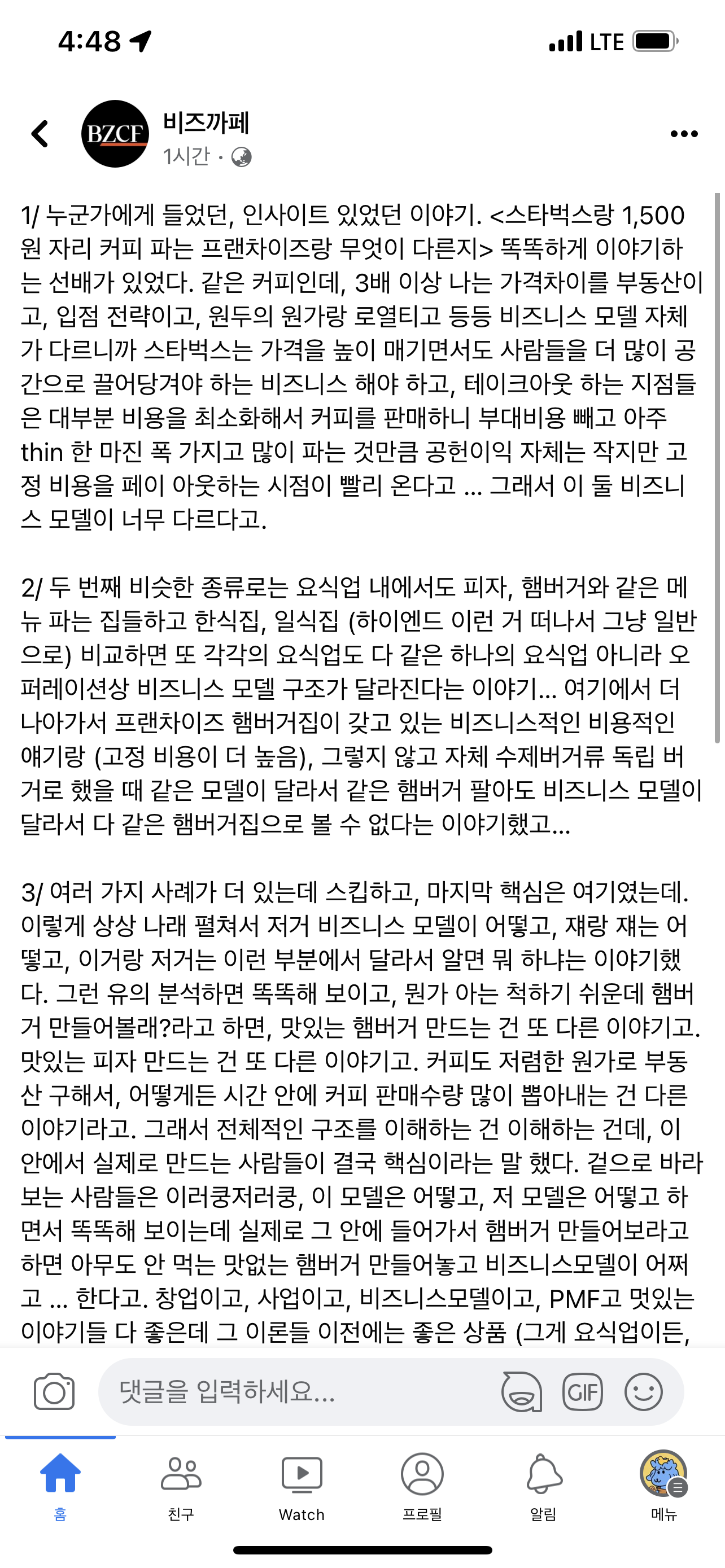 1/ 누군가에게 들었던, 인사이트 있었던 이야기. <스타벅스랑 1,500원 자리 커피 파는 프랜차이즈랑 무엇이 다른지> 똑똑하게 이야기하는 선배가 있었다. 같은 커피인데, 3배 이상 나는 가격차이를 부동산이고, 입점 전략이고, 원두의 원가랑 로열티고 등등 비즈니스 모델 자체가 다르니까 스타벅스는 가격을 높이 매기면서도 사람들을 더 많이 공간으로 끌어당겨야 하는 비즈니스 해야 하고, 테이크아웃 하는 지점들은 대부분 비용을 최소화해서 커피를 판매하니 부대비용 빼고 아주 thin 한 마진 폭 가지고 많이 파는 것만큼 공헌이익 자체는 작지만 고정 비용을 페이 아웃하는 시점이 빨리 온다고 … 그래서 이 둘 비즈니스 모델이 너무 다르다고.