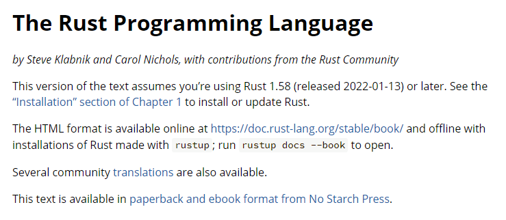 by Steve Klabnik and Carol Nichols, with contributions from the Rust Community This version of the text assumes you’re using Rust 1.58 (released 2022-01-13) or later. See the “Installation” section of Chapter 1 to install or update Rust. The HTML for