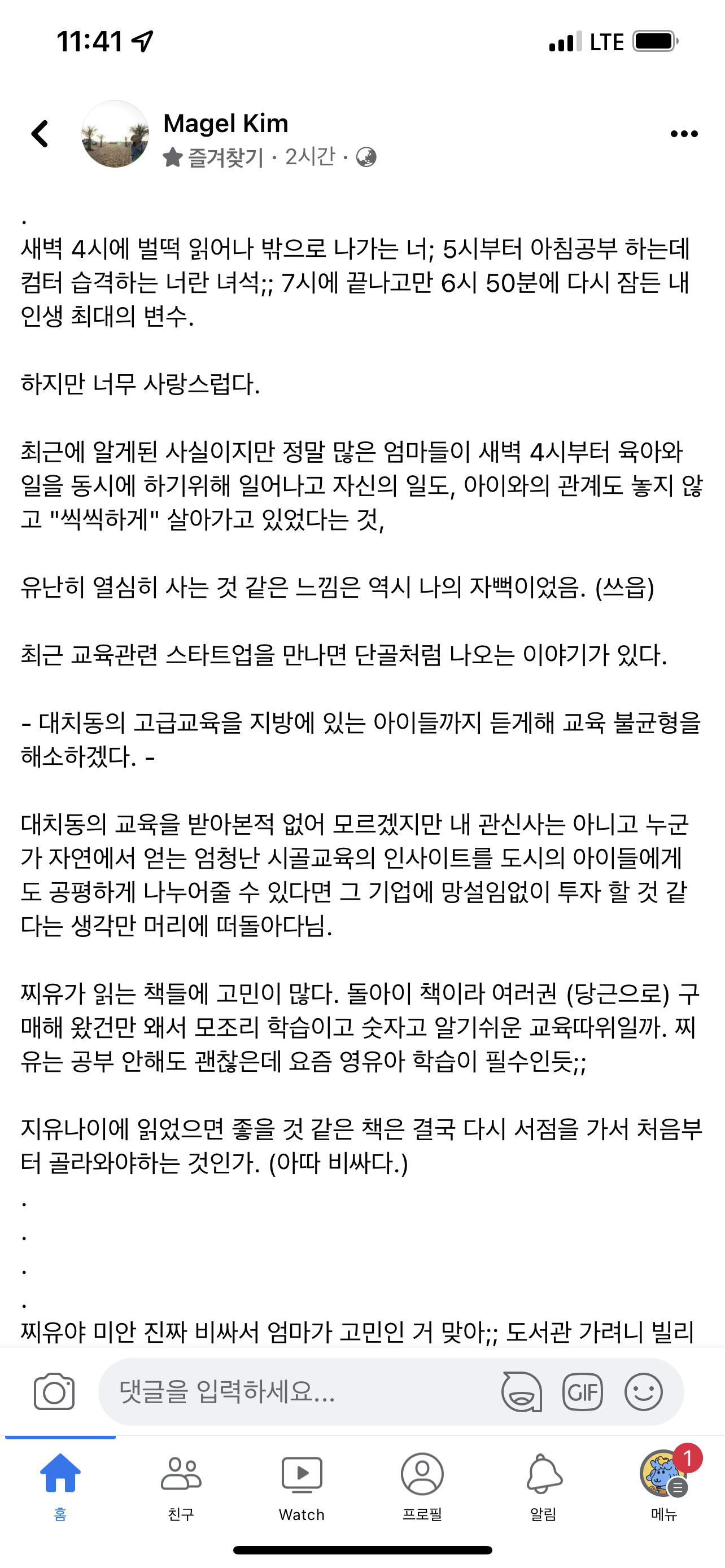 대치동의 교육을 받아본적 없어 모르겠지만 내 관신사는 아니고 누군가 자연에서 얻는 엄청난 시골교육의 인사이트를 도시의 아이들에게도 공평하게 나누어줄 수 있다면 그 기업에 망설임없이 투자 할 것 같다는 생각만 머리에 떠돌아다님.