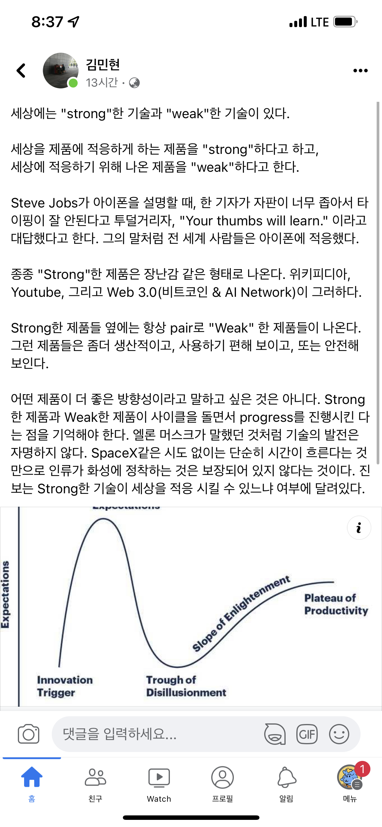 어떤 제품이 더 좋은 방향성이라고 말하고 싶은 것은 아니다. Strong한 제품과 Weak한 제품이 사이클을 돌면서 progress를 진행시킨 다는 점을 기억해야 한다. 엘론 머스크가 말했던 것처럼 기술의 발전은 자명하지 않다. SpaceX같은 시도 없이는 단순히 시간이 흐른다는 것만으로 인류가 화성에 정착하는 것은 보장되어 있지 않다는 것이다. 진보는 Strong한 기술이 세상을 적응 시킬 수 있느냐 여부에 달려있다.