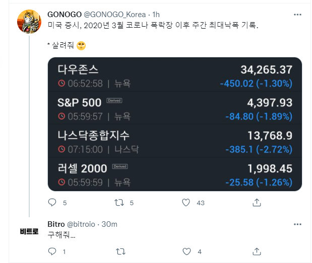 정말 반등이란 것 하나 없이 5%씩 10%씩 20씩 5%씩 몇 주 연속을 빼재낀다.