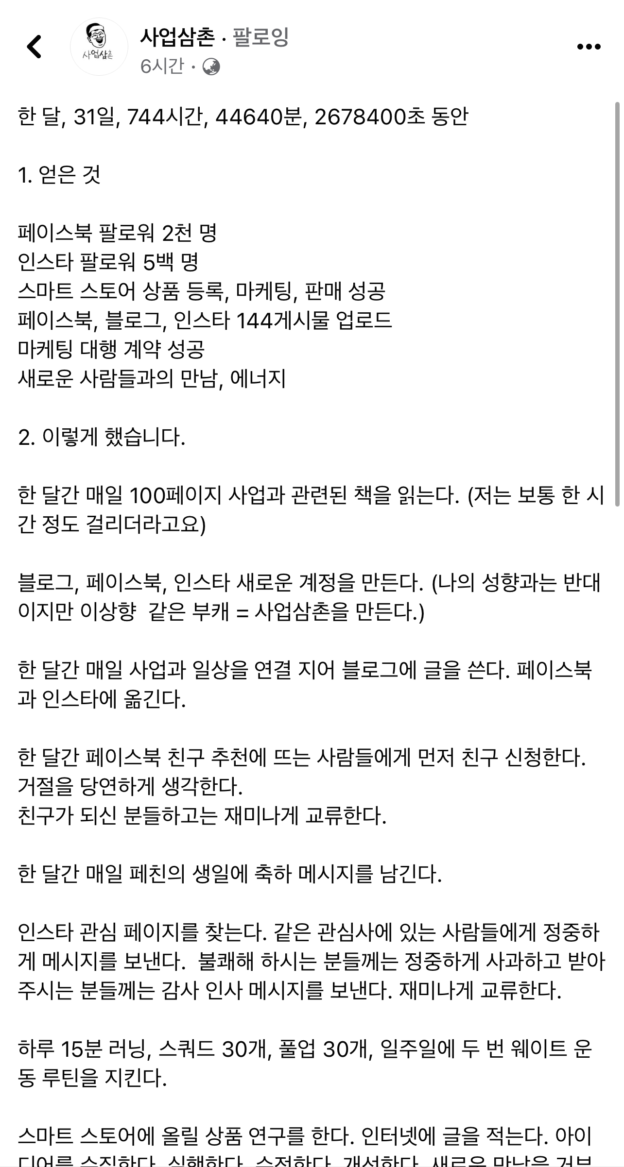 한 달간 매일 사업과 일상을 연결 지어 블로그에 글을 쓴다. 페이스북과 인스타에 옮긴다.
