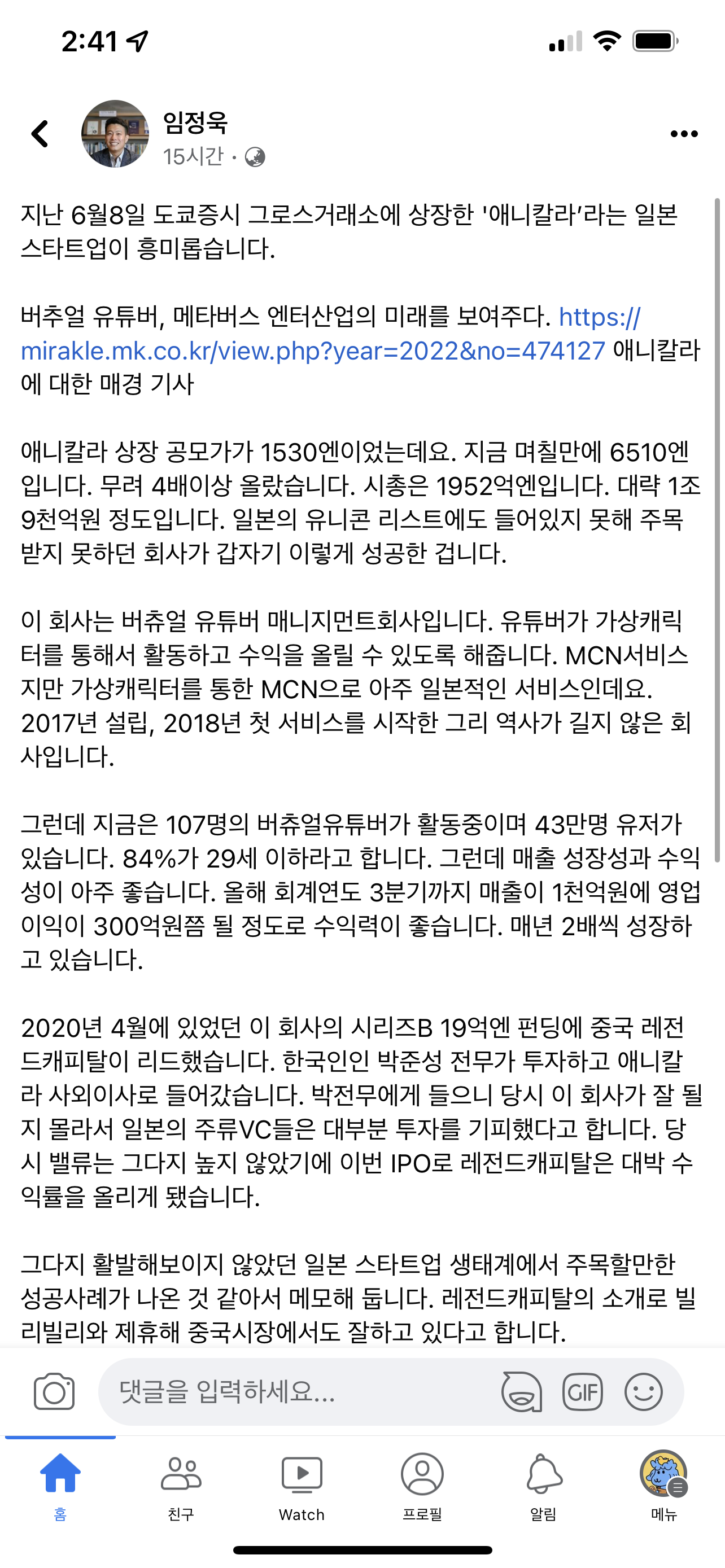 애니칼라 상장 공모가가 1530엔이었는데요. 지금 며칠만에 6510엔입니다. 무려 4배이상 올랐습니다. 시총은 1952억엔입니다. 대략 1조9천억원 정도입니다. 일본의 유니콘 리스트에도 들어있지 못해 주목받지 못하던 회사가 갑자기 이렇게 성공한 겁니다.