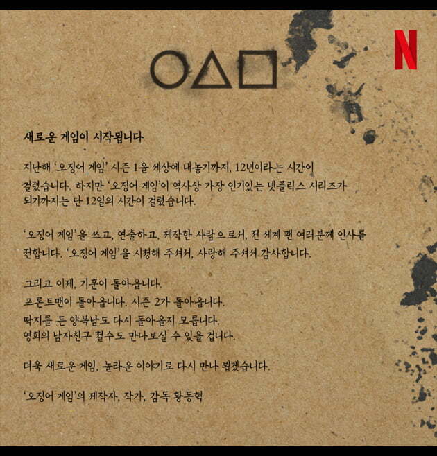 '오징어 게임' 시즌 2 제작 확정…"기훈·프론트맨 돌아온다" [공식], 황동혁 감독·넷플릭스 '오징어 게임' 시즌 2 제작 발표