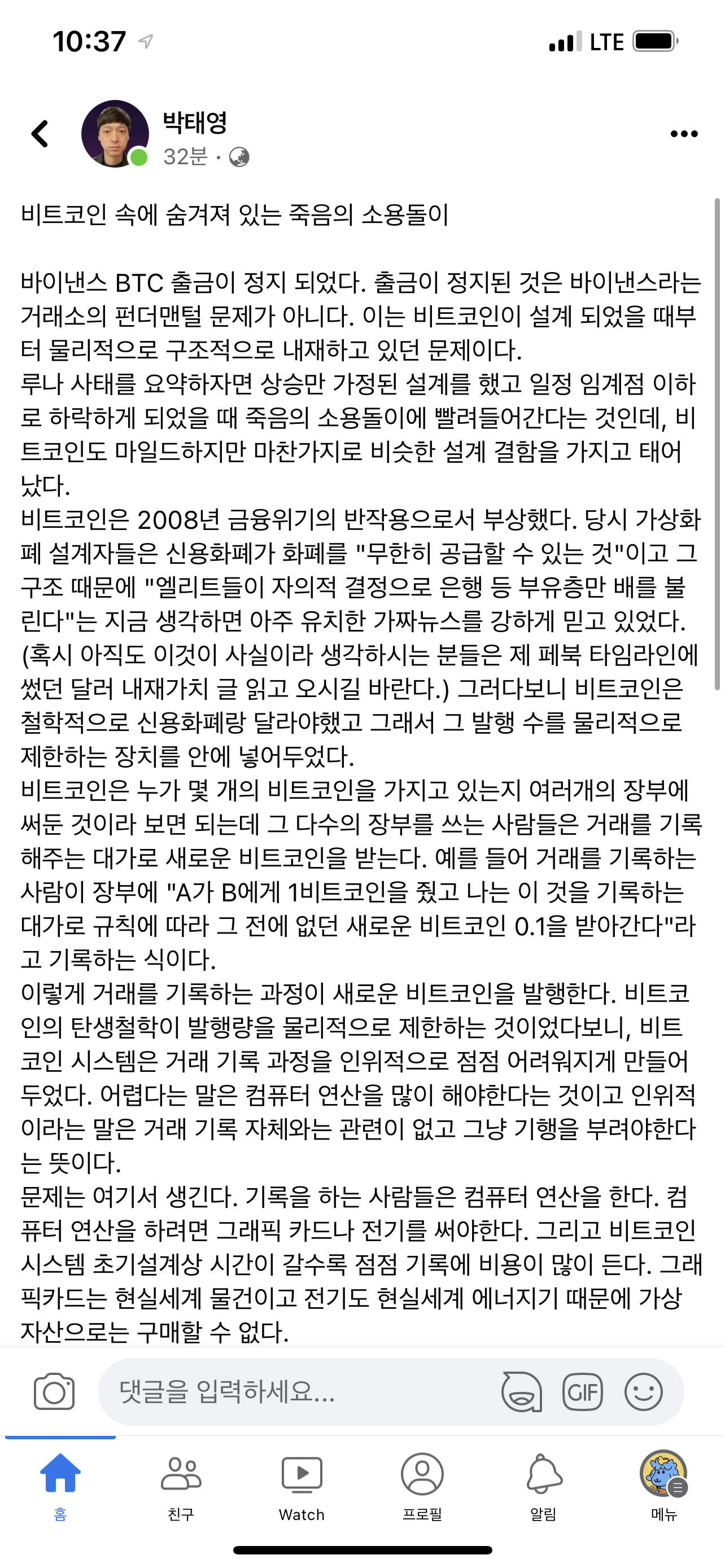 문제는 시간이 지나 설계에 따라 거래 비용은 비싸지고 비트코인 가격이 하락할 때이다. 거래를 기록하는 사람들 입장에서는 비트코인 시스템이 제공하는 새 비트코인으로 그래픽카드와 전기료를 충당하지 못할 수 있고 또 비트코인이 하락 중이기 때문에 비트코인으로 대가를 받는 것을 꺼려하게 된다. 그래서 거래를 일단 중단하게 된다. 그게 바이낸스가 거래 기록하는 사람들한테 거래 기록을 요청했는데 거부당한 현재 BTC 인출 정지 사태다.