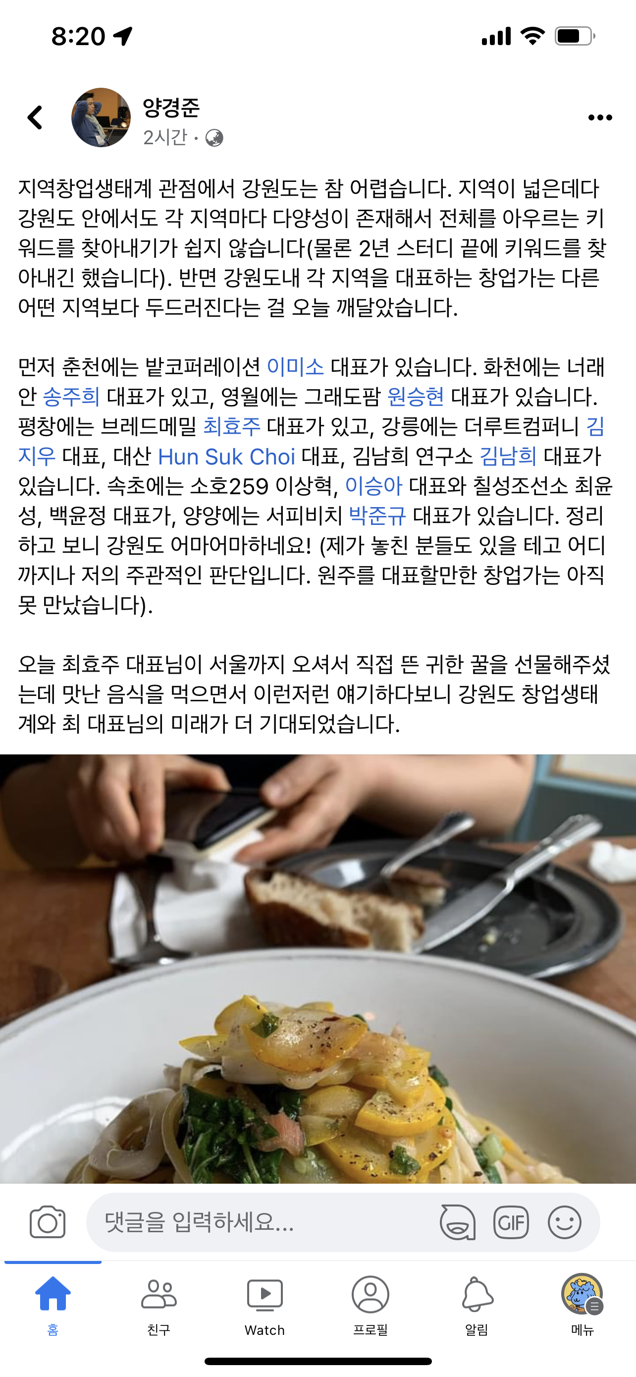 지역창업생태계 관점에서 강원도는 참 어렵습니다. 지역이 넓은데다 강원도 안에서도 각 지역마다 다양성이 존재해서 전체를 아우르는 키워드를 찾아내기가 쉽지 않습니다(물론 2년 스터디 끝에 키워드를 찾아내긴 했습니다). 반면 강원도내 각 지역을 대표하는 창업가는 다른 어떤 지역보다 두드러진다는 걸 오늘 깨달았습니다.