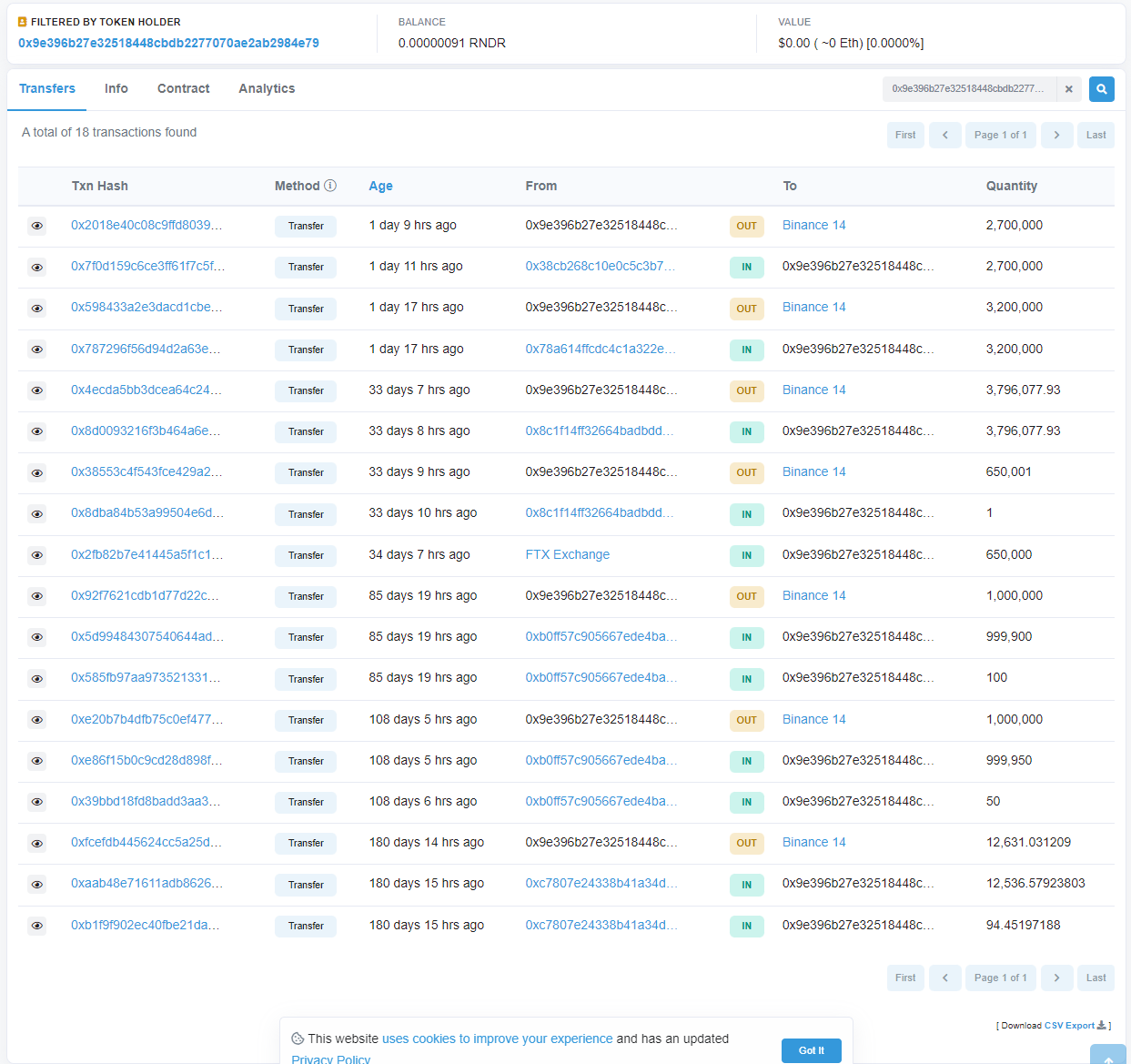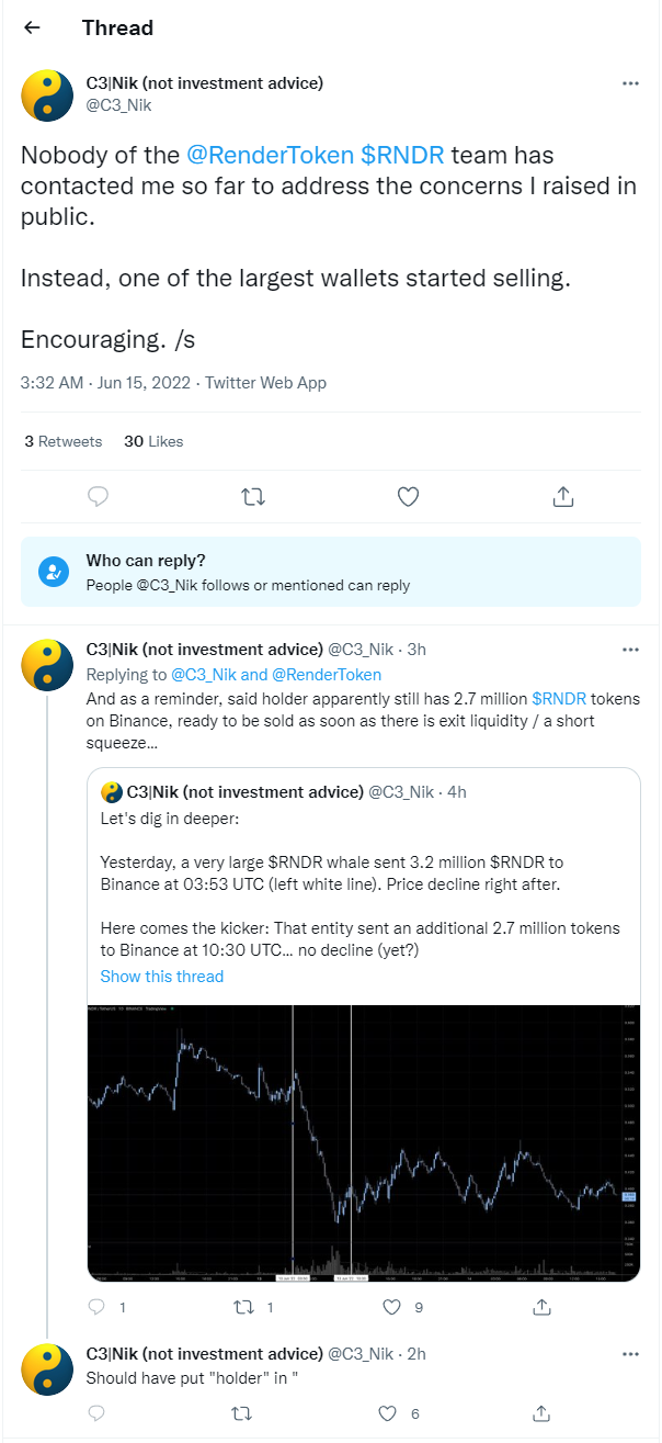 “Nobody of the @RenderToken $RNDR team has contacted me so far to address the concerns I raised in public. Instead, one of the largest wallets started selling. Encouraging. /s”