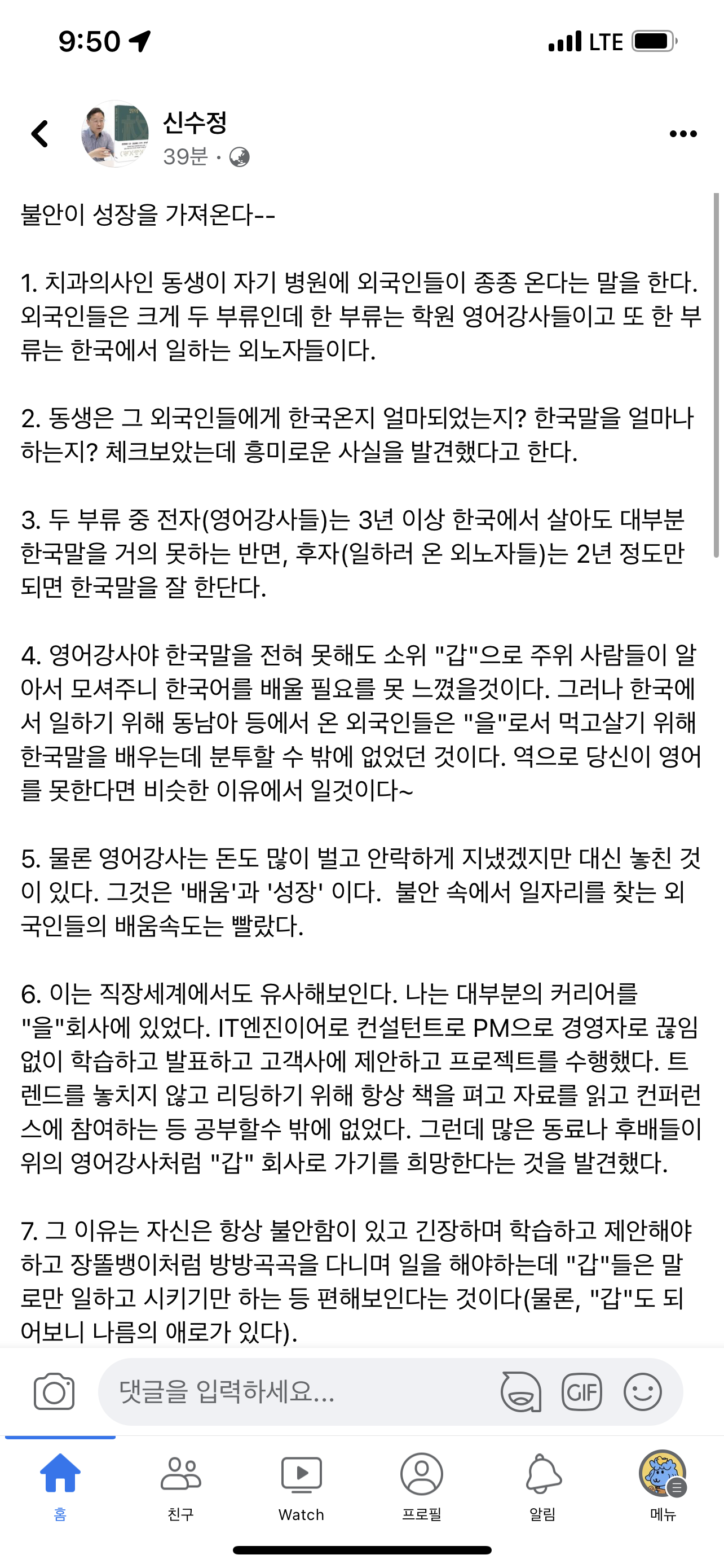6. 이는 직장세계에서도 유사해보인다. 나는 대부분의 커리어를 "을"회사에 있었다. IT엔진이어로 컨설턴트로 PM으로 경영자로 끊임없이 학습하고 발표하고 고객사에 제안하고 프로젝트를 수행했다. 트렌드를 놓치지 않고 리딩하기 위해 항상 책을 펴고 자료를 읽고 컨퍼런스에 참여하는 등 공부할수 밖에 없었다. 그런데 많은 동료나 후배들이 위의 영어강사처럼 "갑" 회사로 가기를 희망한다는 것을 발견했다.