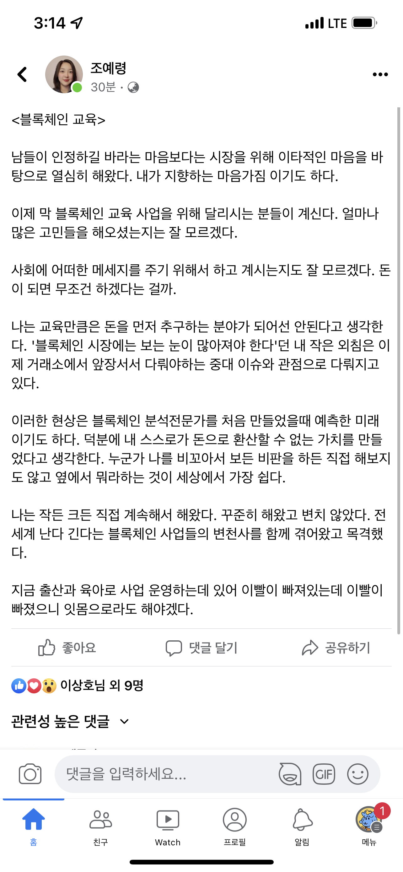 나는 교육만큼은 돈을 먼저 추구하는 분야가 되어선 안된다고 생각한다. '블록체인 시장에는 보는 눈이 많아져야 한다'던 내 작은 외침은 이제 거래소에서 앞장서서 다뤄야하는 중대 이슈와 관점으로 다뤄지고 있다.