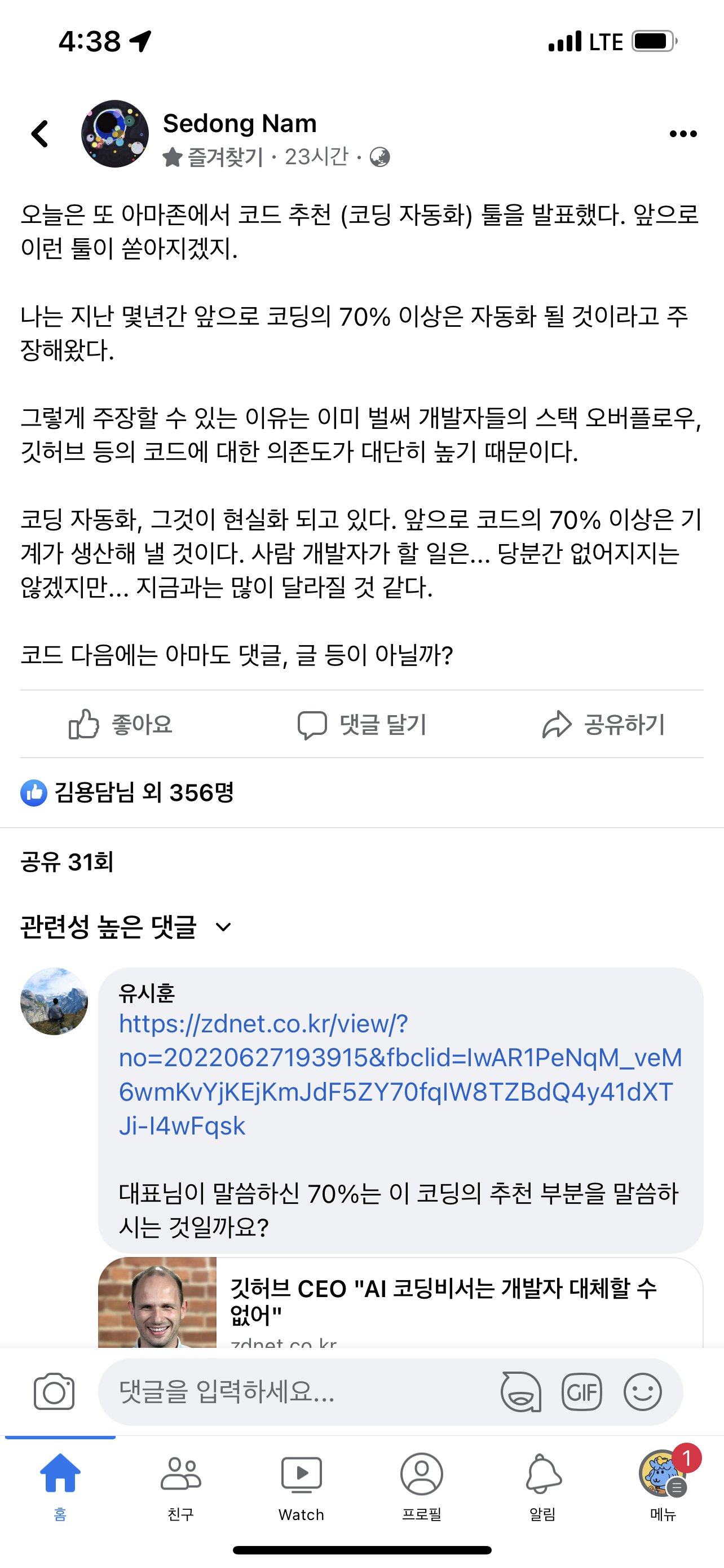 나는 지난 몇년간 앞으로 코딩의 70% 이상은 자동화 될 것이라고 주장해왔다.