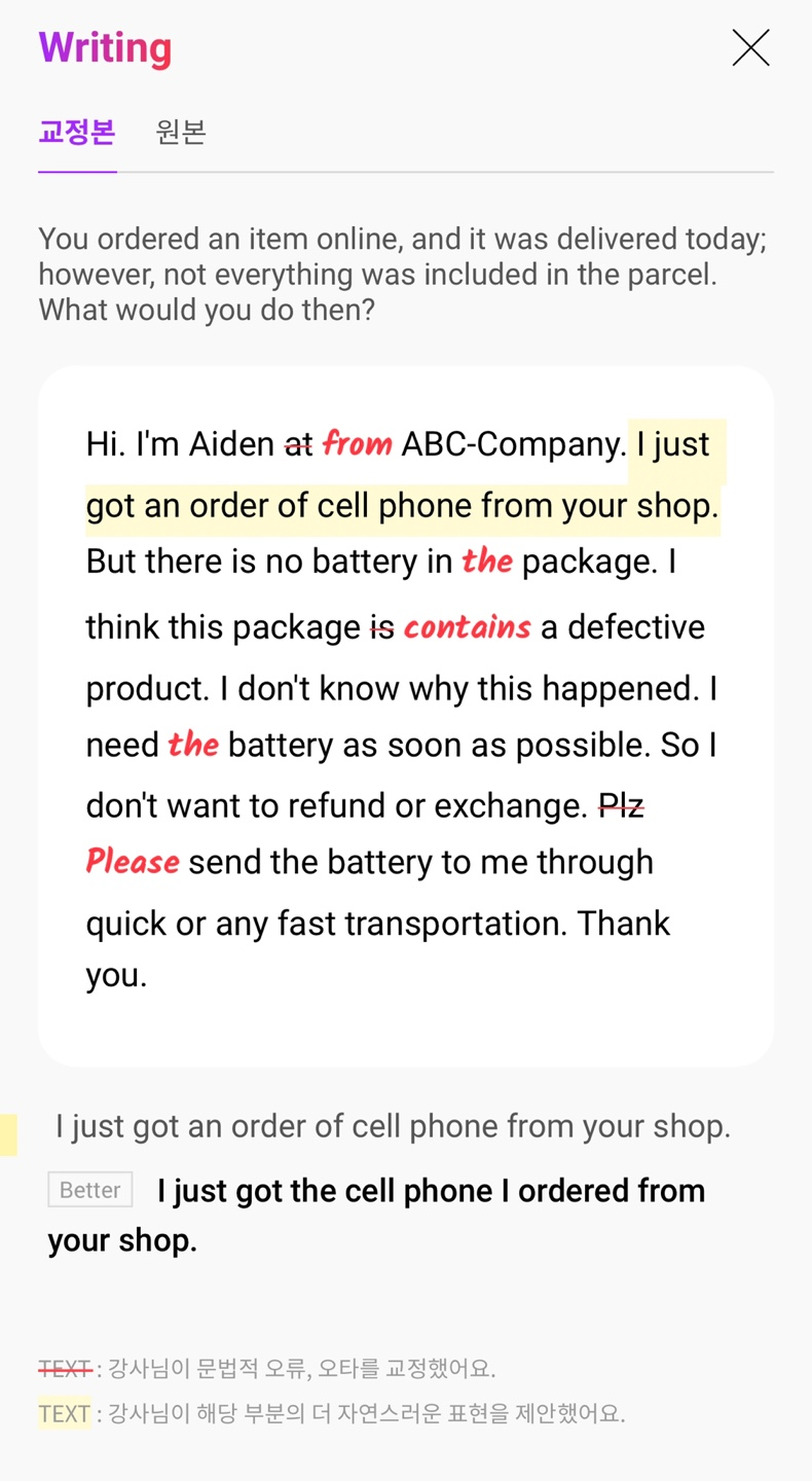 Hi. I'm Aiden at ABC-Company. I just got an order of cell phone from your shop. But there is no battery in package. I think this package is a defective product. I don't know why this happened. I need battery as soon as possible. So I don't want to refund or exchange. Plz send the battery to me through quick or any fast transportation. Thank you.