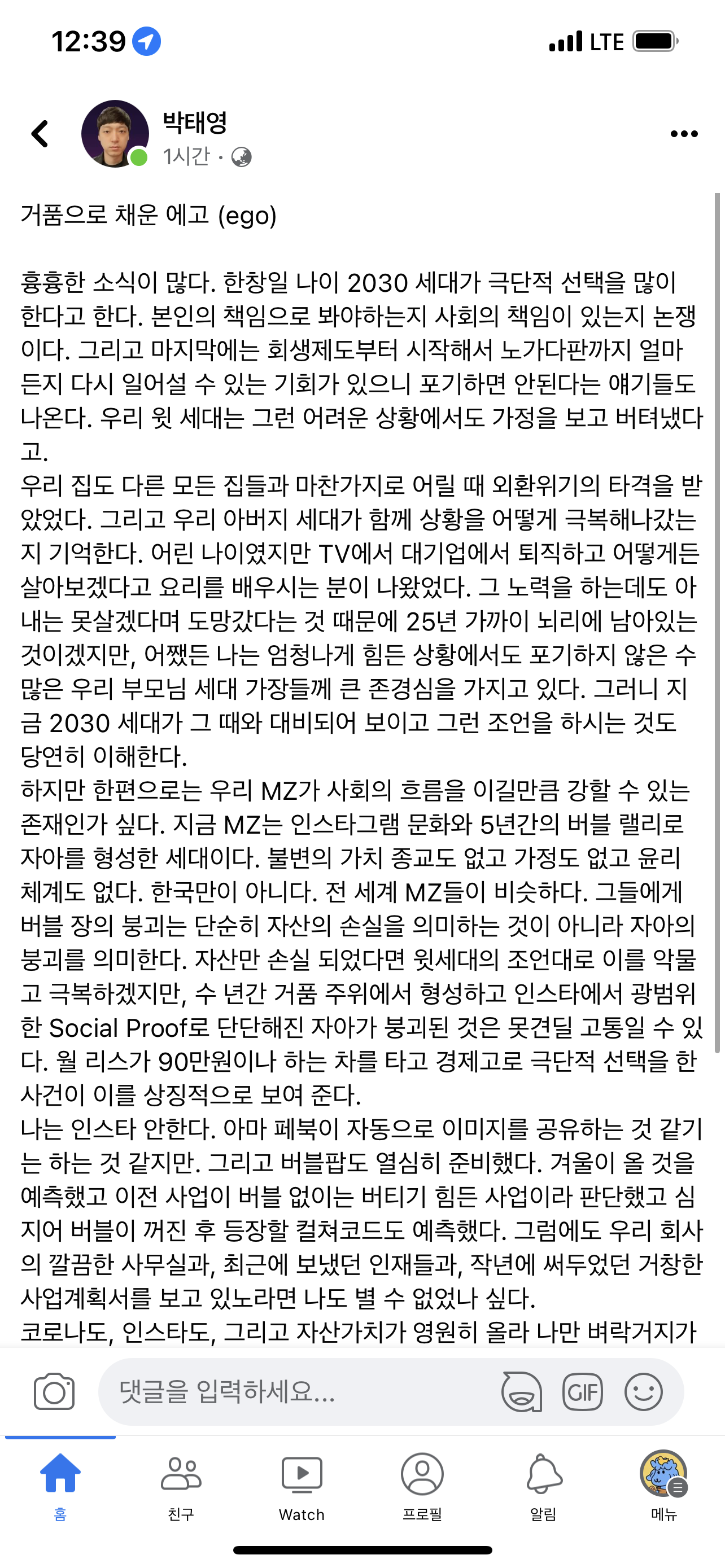 하지만 한편으로는 우리 MZ가 사회의 흐름을 이길만큼 강할 수 있는 존재인가 싶다. 지금 MZ는 인스타그램 문화와 5년간의 버블 랠리로 자아를 형성한 세대이다. 불변의 가치 종교도 없고 가정도 없고 윤리 체계도 없다. 한국만이 아니다. 전 세계 MZ들이 비슷하다. 그들에게 버블 장의 붕괴는 단순히 자산의 손실을 의미하는 것이 아니라 자아의 붕괴를 의미한다. 자산만 손실 되었다면 윗세대의 조언대로 이를 악물고 극복하겠지만, 수 년간 거품 주위에서 형성하고 인스타에서 광범위한 Social Proof로 단단해진 자아가 붕괴된 것은 못견딜 고통일 수 있다. 월 리스가 90만원이나 하는 차를 타고 경제고로 극단적 선택을 한 사건이 이를 상징적으로 보여 준다.
