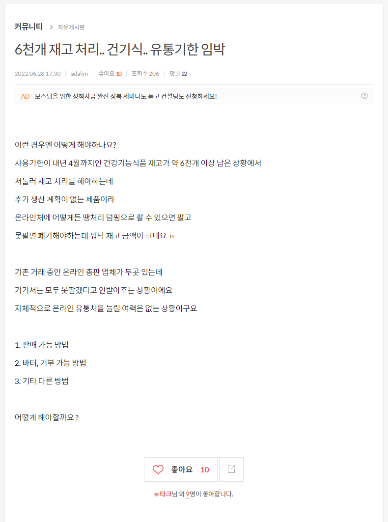 이런 경우엔 어떻게 해야하나요?사용기한이 내년 4월까지인 건강기능식품 재고가 약 6천개 이상 남은 상황에서 서둘러 재고 처리를 해야하는데 추가 생산 계획이 없는 제품이라 온라인처에...