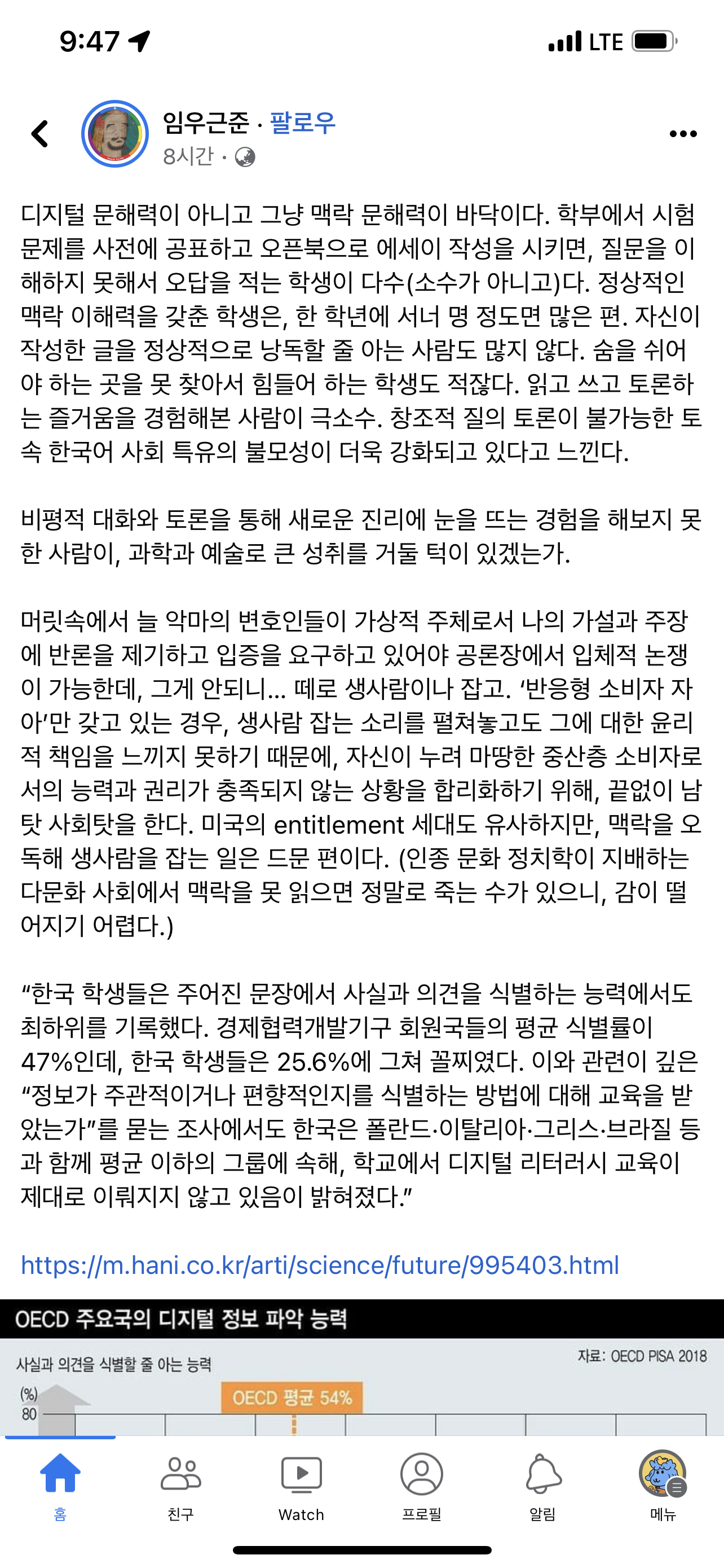 디지털 문해력이 아니고 그냥 맥락 문해력이 바닥이다. 학부에서 시험 문제를 사전에 공표하고 오픈북으로 에세이 작성을 시키면, 질문을 이해하지 못해서 오답을 적는 학생이 다수(소수가 아니고)다. 정상적인 맥락 이해력을 갖춘 학생은, 한 학년에 서너 명 정도면 많은 편. 자신이 작성한 글을 정상적으로 낭독할 줄 아는 사람도 많지 않다. 숨을 쉬어야 하는 곳을 못 찾아서 힘들어 하는 학생도 적잖다. 읽고 쓰고 토론하는 즐거움을 경험해본 사람이 극소수. 창조적 질의 토론이 불가능한 토속 한국어 사회 특유의 불모성이 더욱 강화되고 있다고 느낀다.