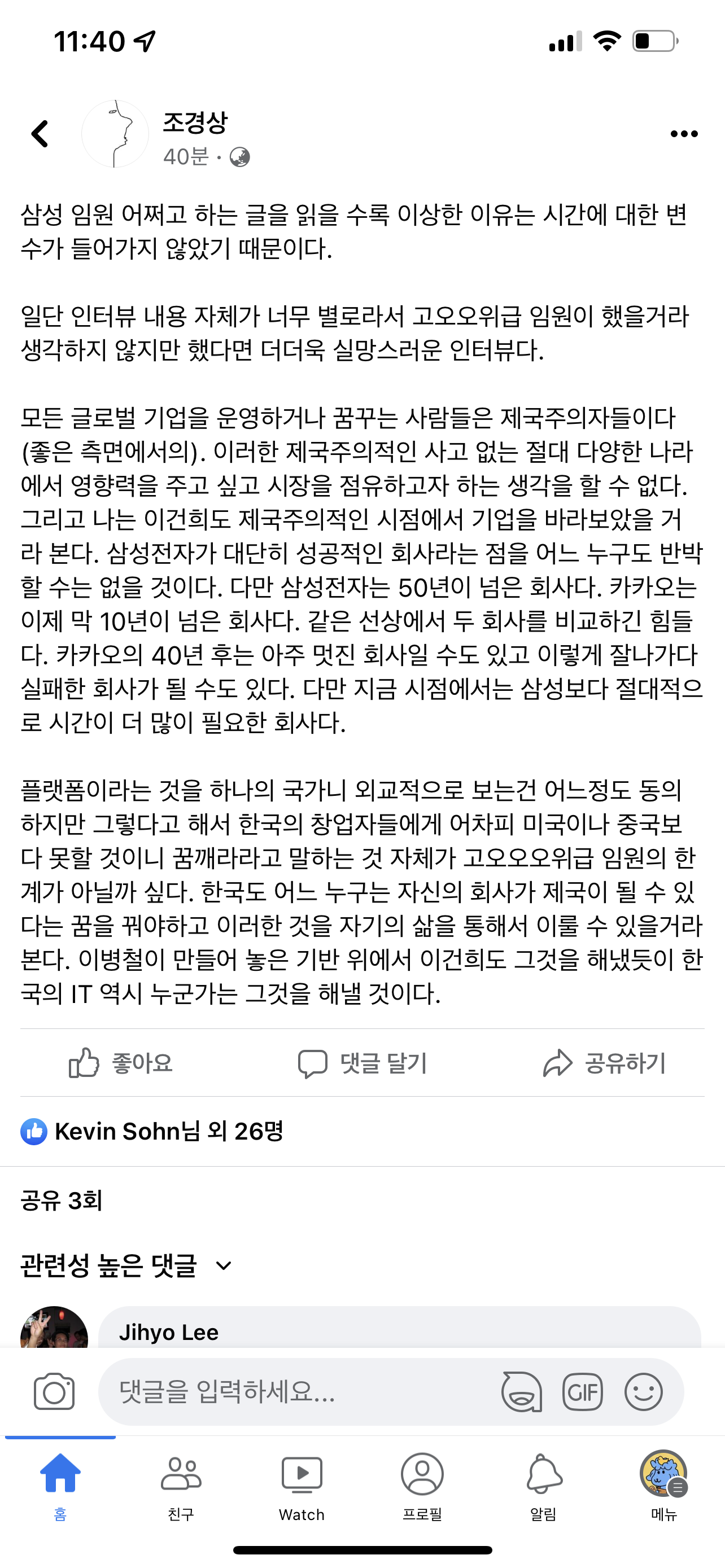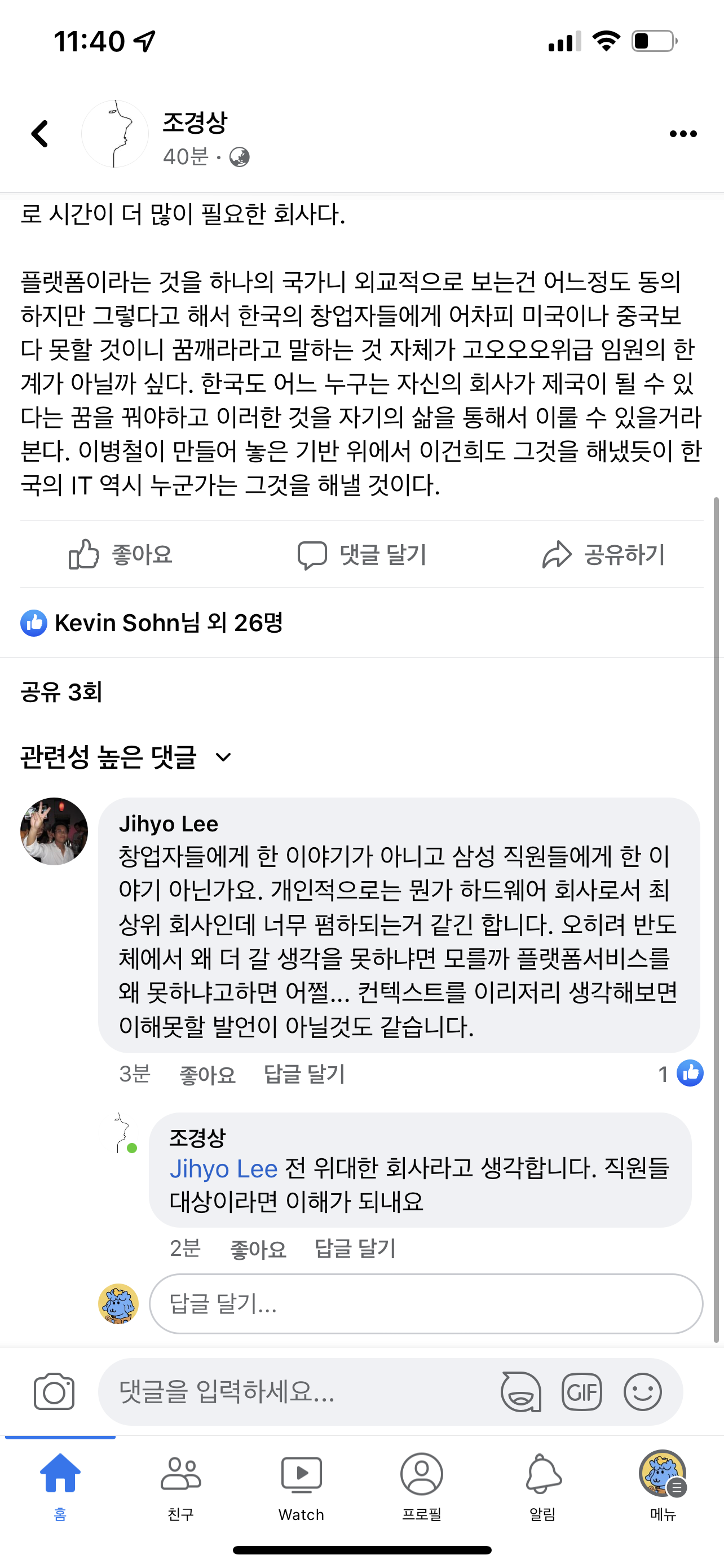 회사가 (삼전을 지칭) 그런 업을 못하는 것이 아니라 할 깜이 안되는 업이라고 생각한겁니다. 우리는 작은 사업부도 인력규모가 5천명이 넘습니다. 그럼에도 흑자를 내는 사업을 합니다. 거... 배달하고 중고거래해서 우리 사업부 유지 되겠어요? 그런업은 남겨둬야 또 그분들도 먹고살지...(진지하게 그리 생각하는 느낌) 무선매출이 100조 정도지요? 그런사업해서는 기스도 안납니다.