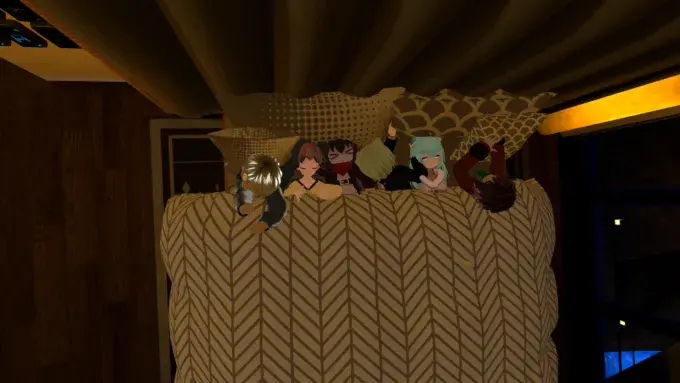 메타버스 주민의 밤은 늦다. 아니, 단순히 필자가 야행성 커뮤니티에 속해있을 뿐이지만, 평일에도 새벽 2시까지 놀고 있는 사람도 있다. 새벽 1시까지는 빅 타임이라고 불리는 상태이다. 언제나 대부분 밤 늦게까지 친구와 잡담을 나누거나, 월드 이곳 저곳을 탐색하거나, 유행 중인 월드에 놀러 가본 후, 졸리기 시작하면 어두운 방 안에 침대만 있는 이른바 「수면 월드」에 이동한다. 그리고 그대로 잠든다. 물론 로그인한 그대로. 사람에 따라서는 VR 고글을 착용한채로 말이다
